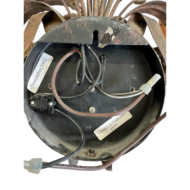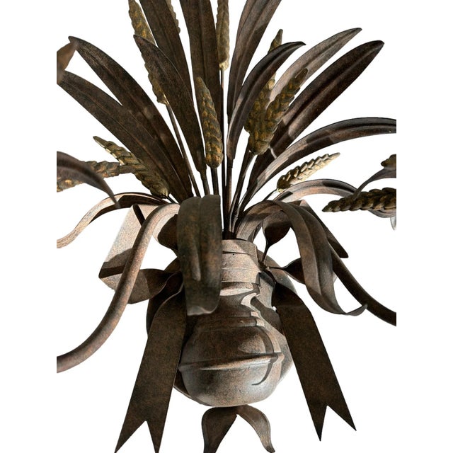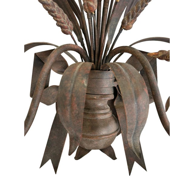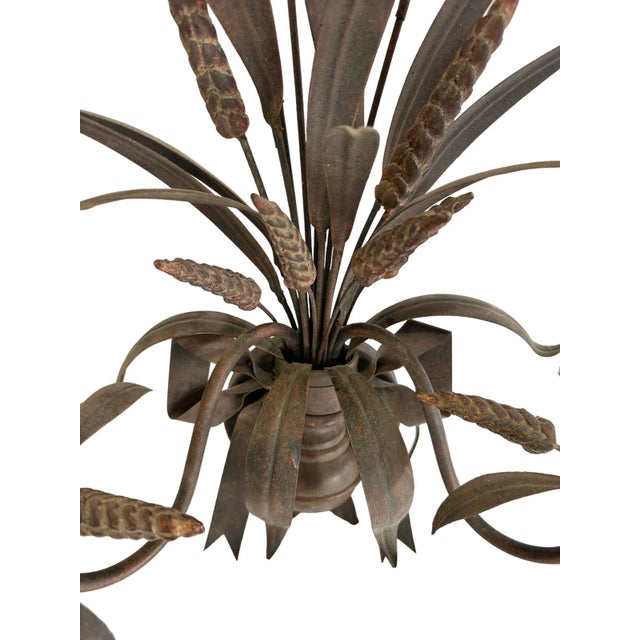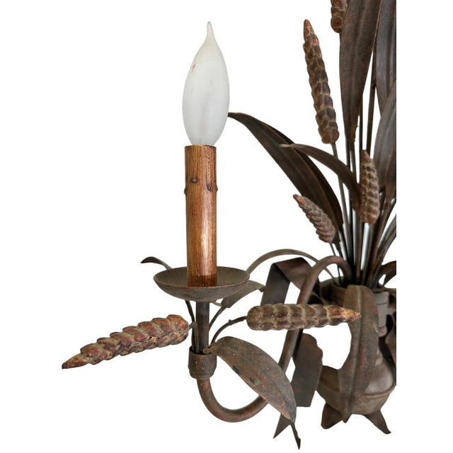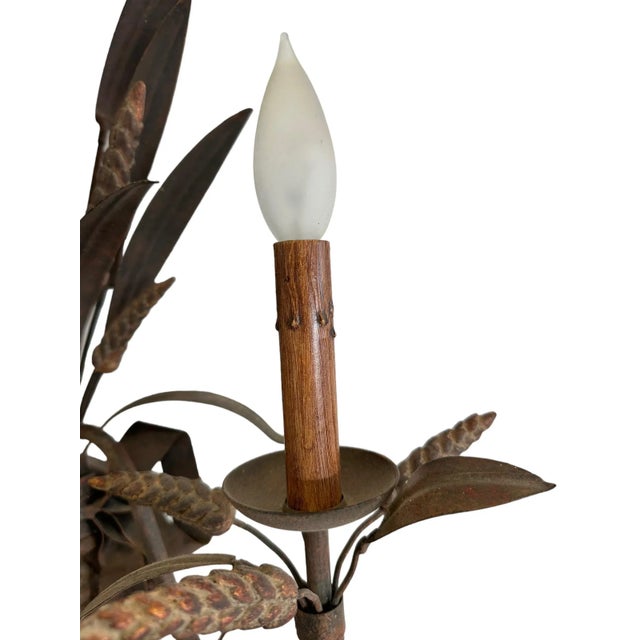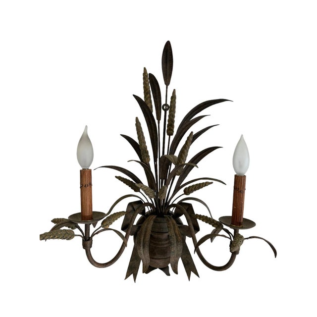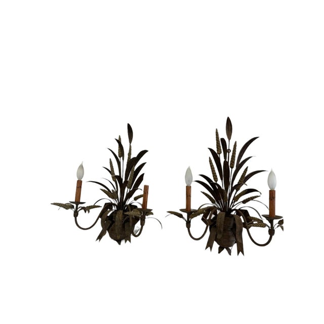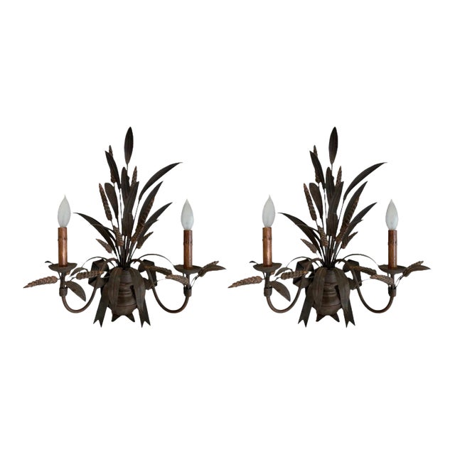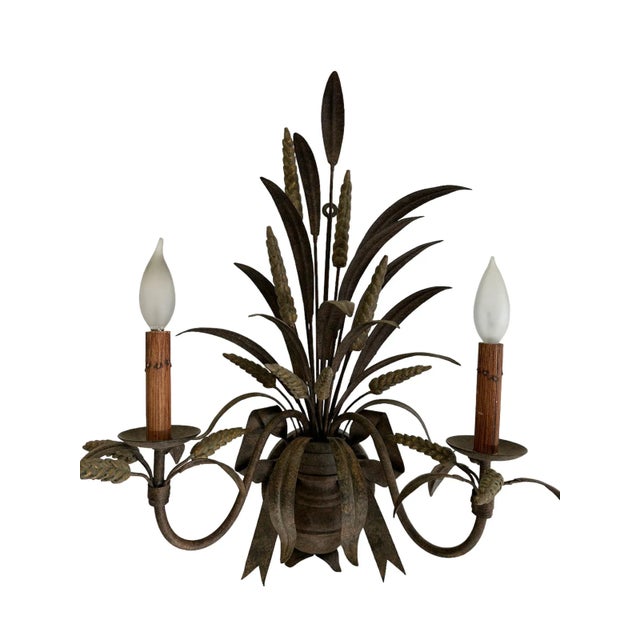 Featuring a beautiful matte / rustic bronze finish, this pair features realistic wheat and bow motifs with two faux wood candlestick lights. This pair came from the Homestead Inn in Greenwich, Connecticut.