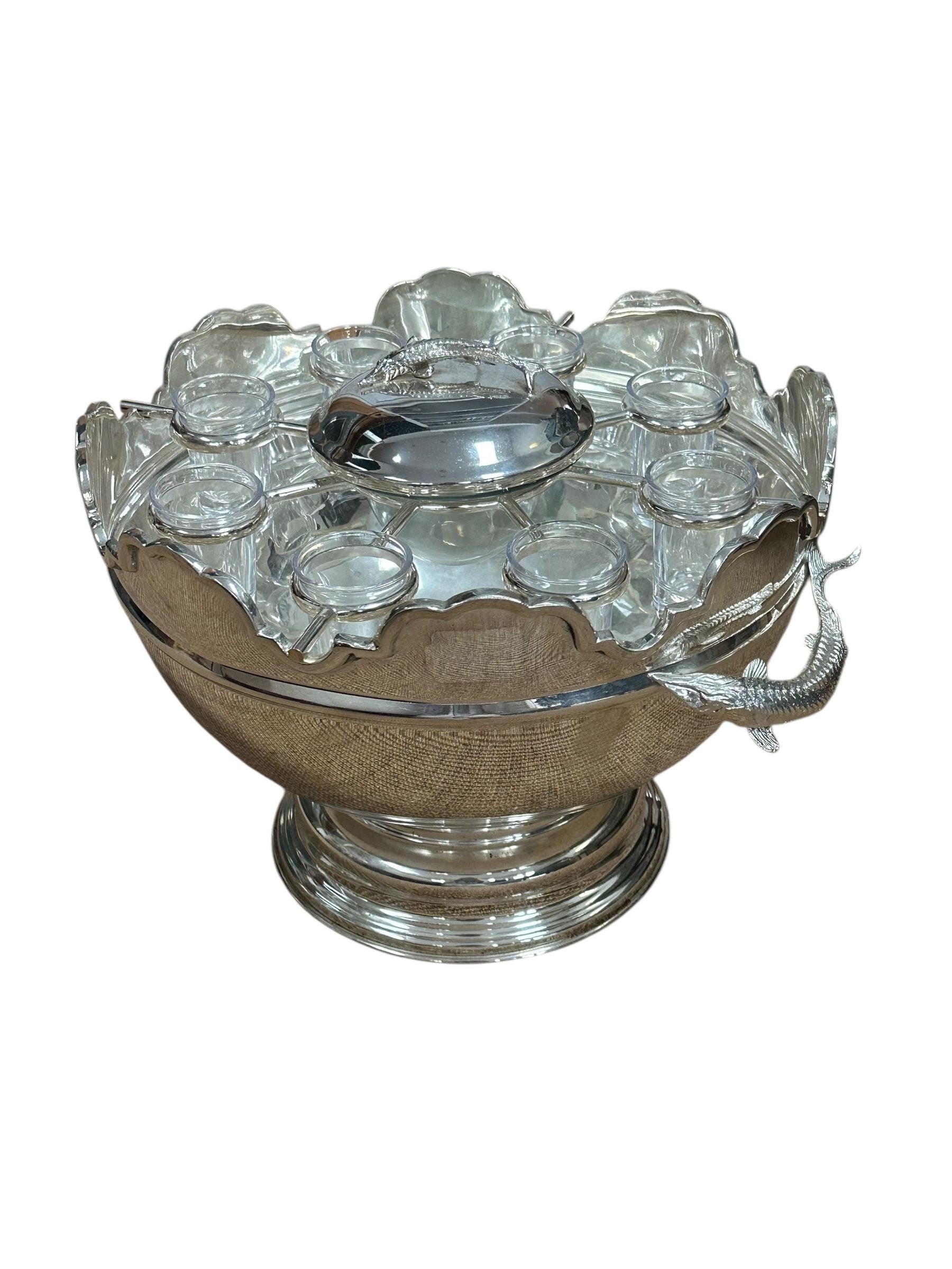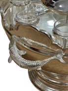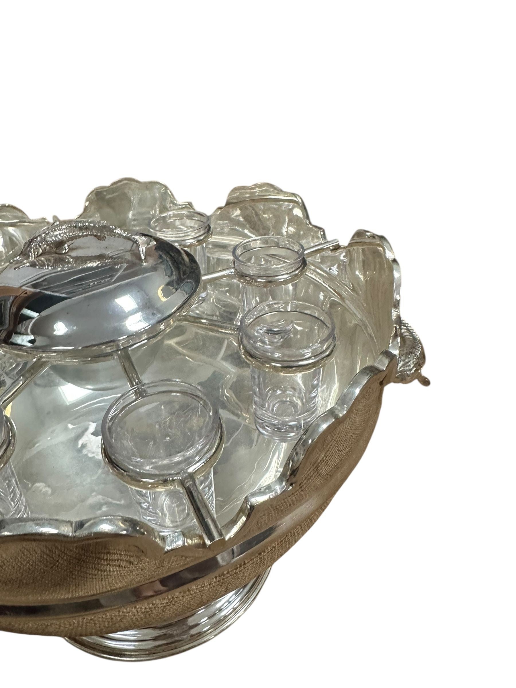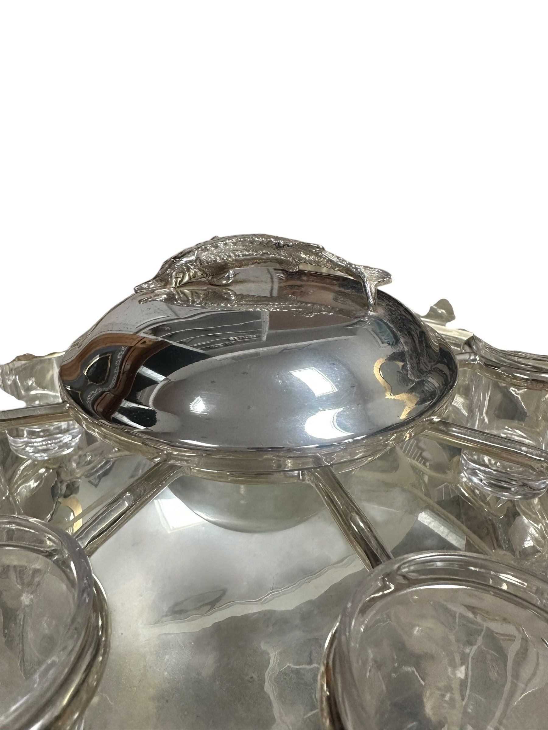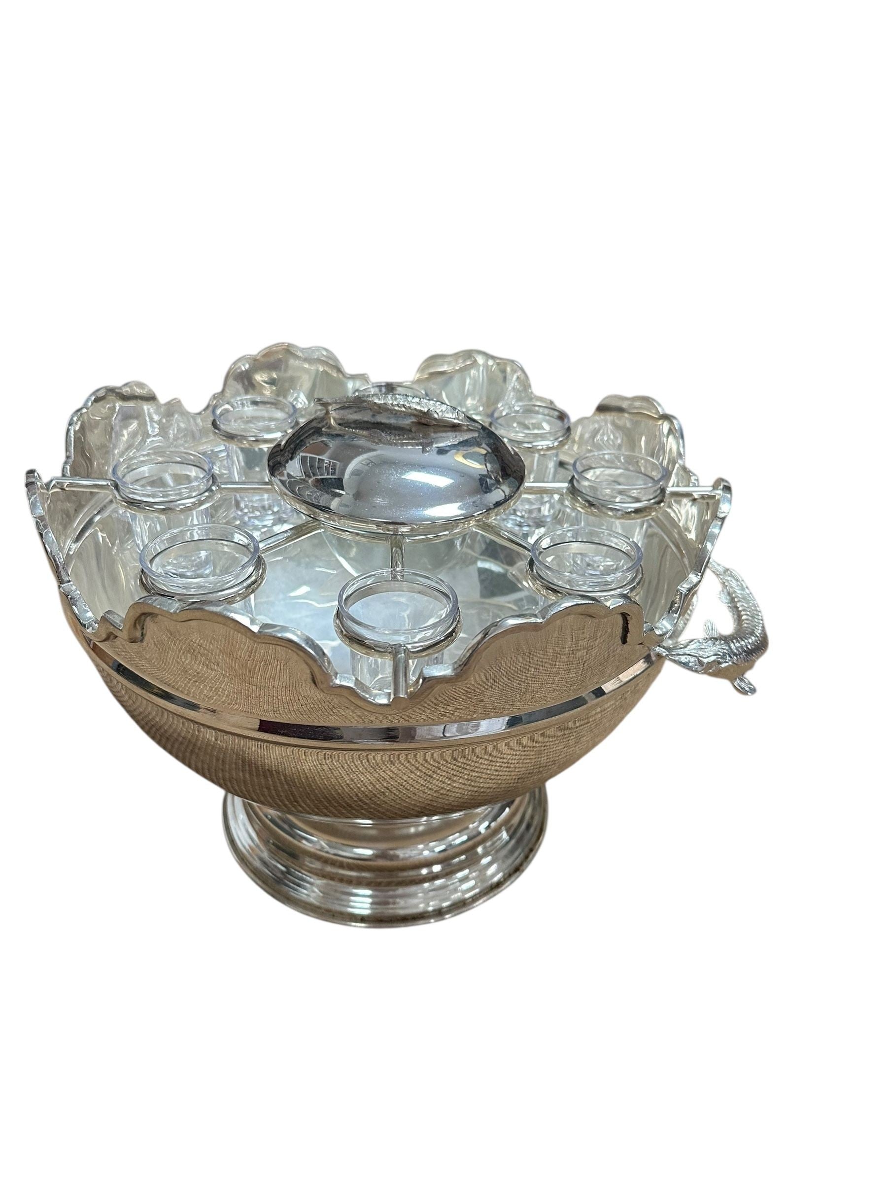 A striking vintage silverplate and glass Monteith bowl server designed for traditional caviar and vodka service. This sculptural piece features a removable molded glass insert with scalloped compartments surrounding a central lidded well, ideal for ice, condiments, or accompaniments. The silverplate base is beautifully modeled with sturgeon relief handles, a classic and symbolic motif associated with formal caviar service, and rests on a stepped pedestal foot that gives the piece strong architectural presence.