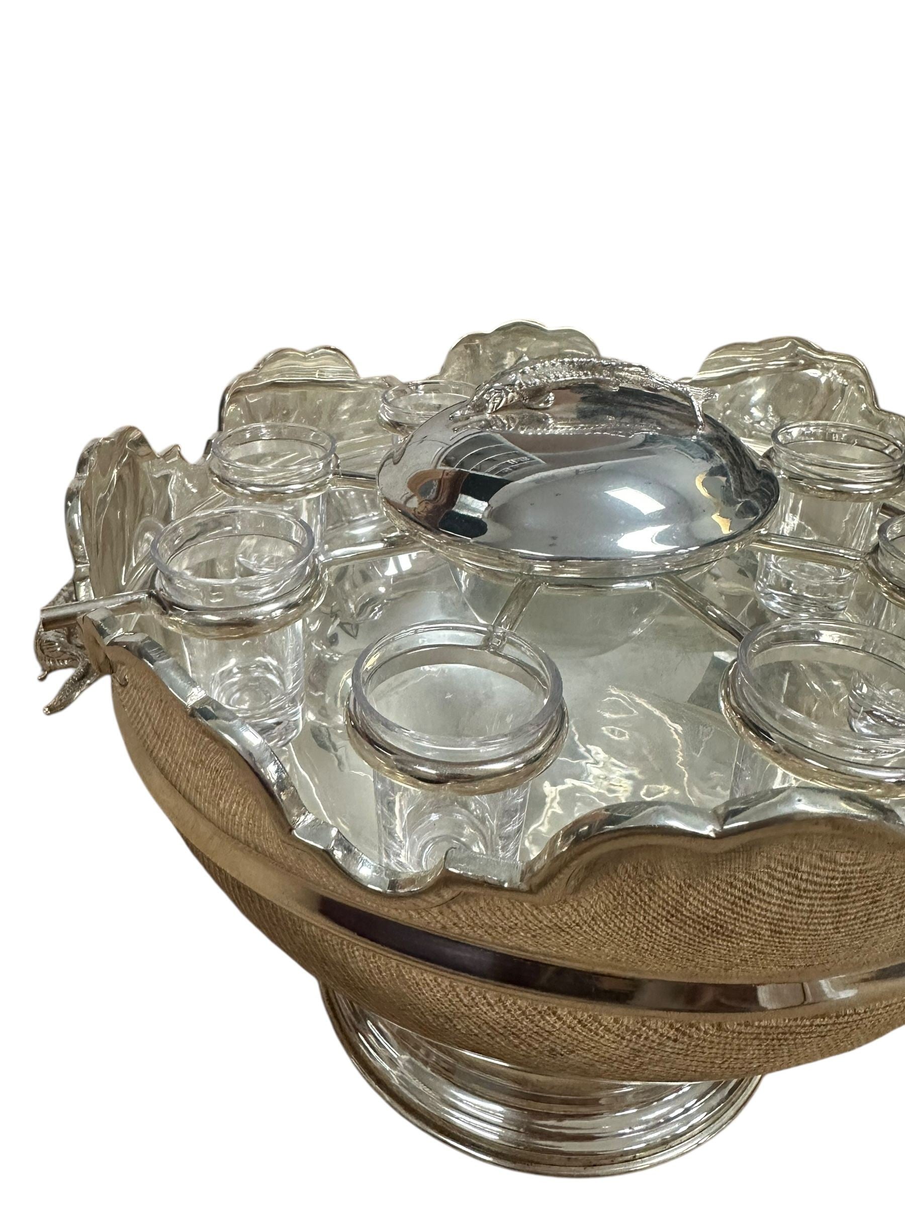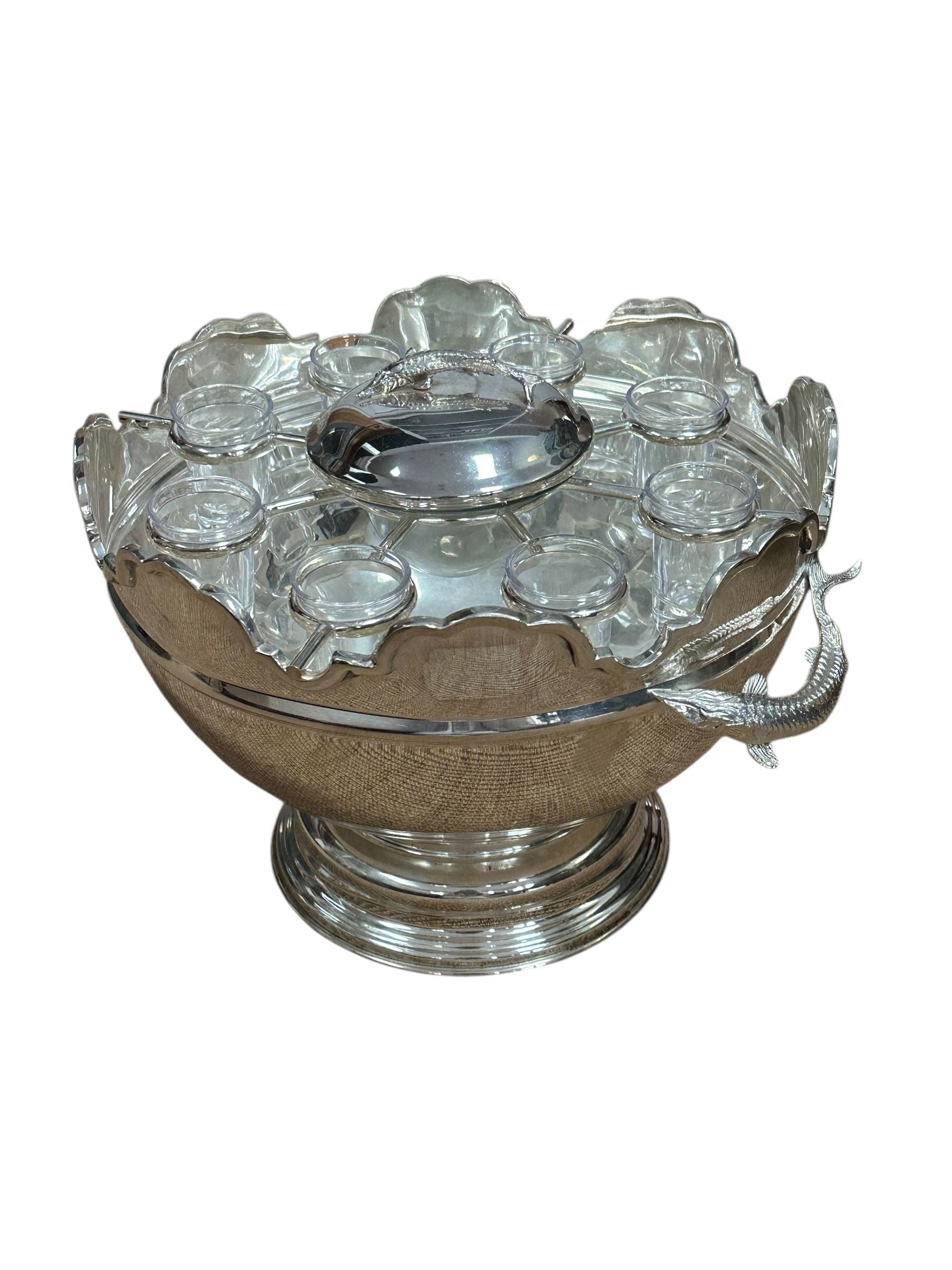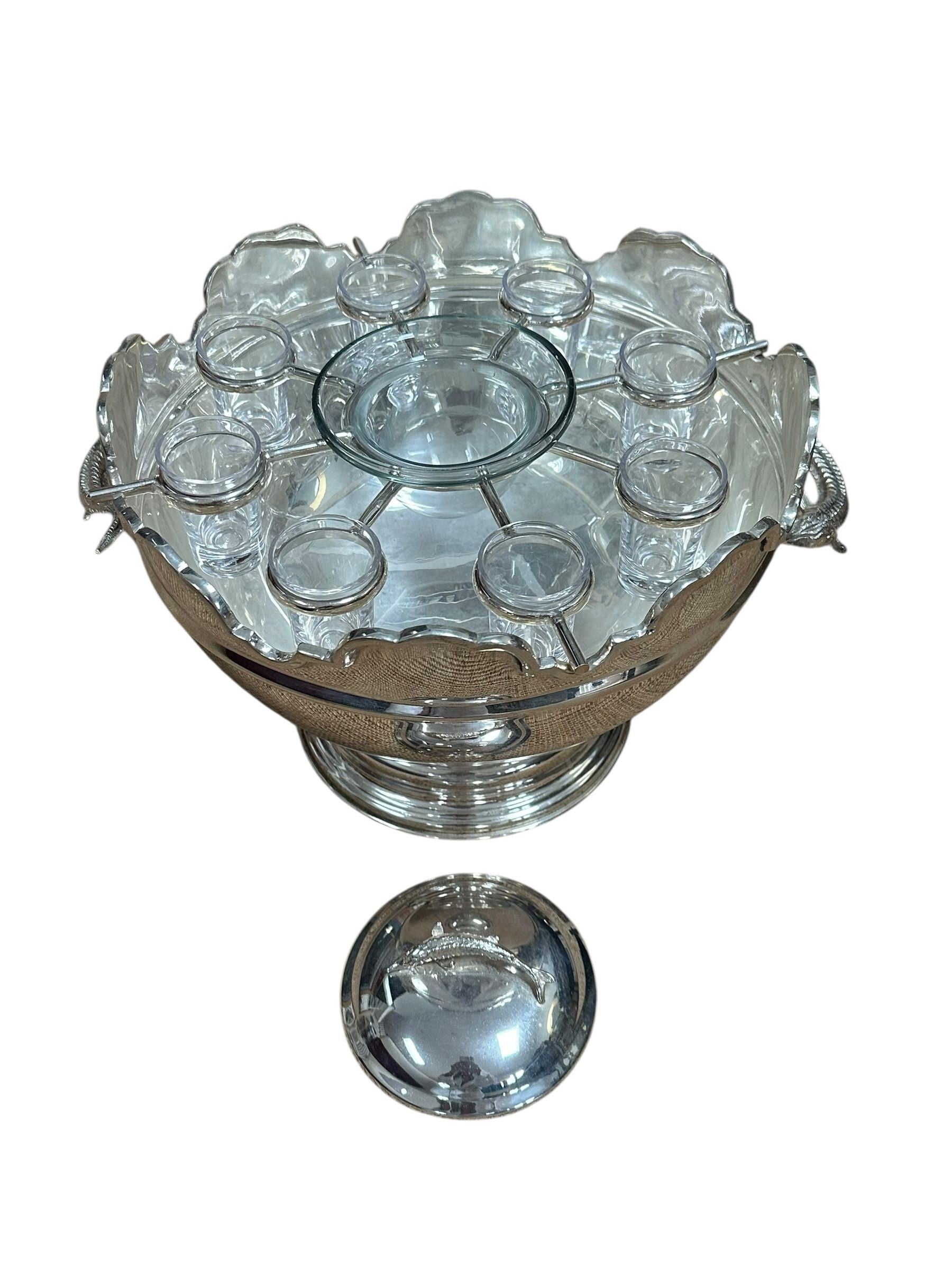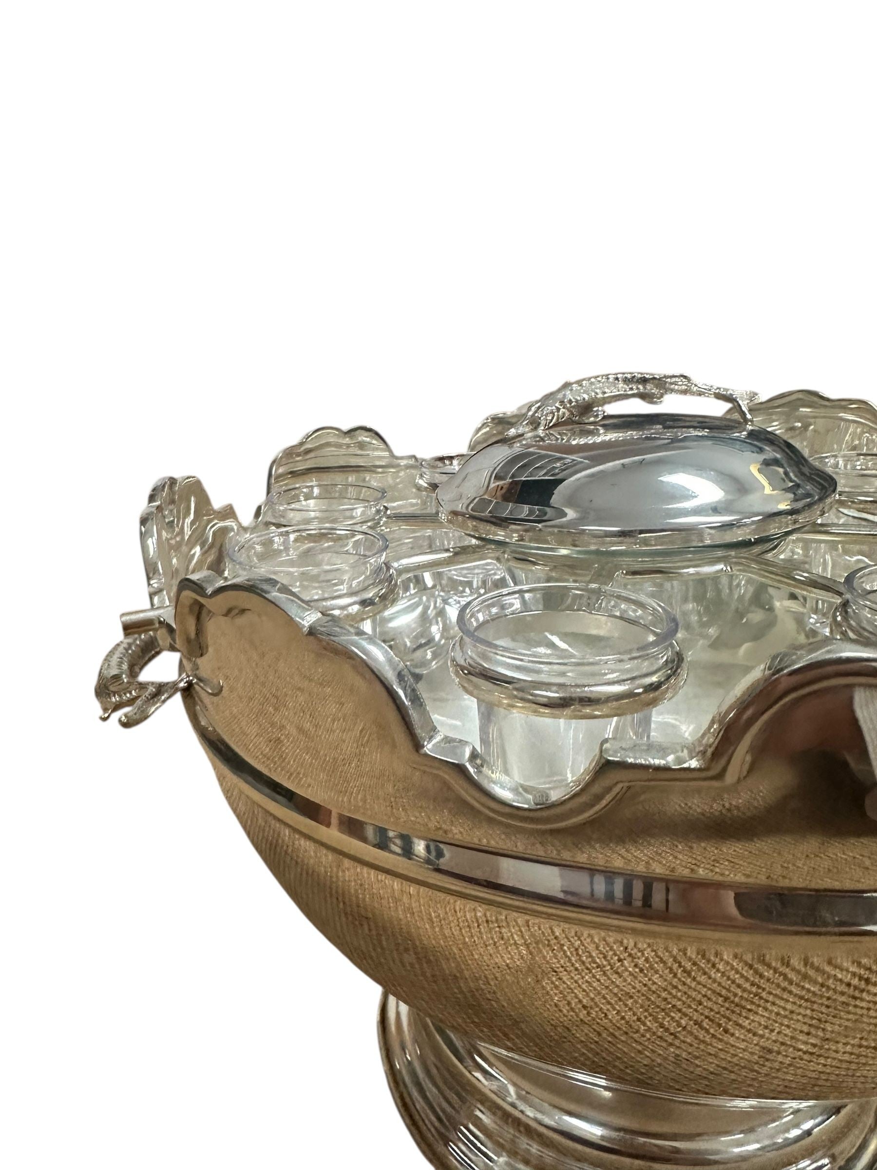A striking vintage silverplate and glass Monteith bowl server designed for traditional caviar and vodka service. This sculptural piece features a removable molded glass insert with scalloped compartments surrounding a central lidded well, ideal for ice, condiments, or accompaniments. The silverplate base is beautifully modeled with sturgeon relief handles, a classic and symbolic motif associated with formal caviar service, and rests on a stepped pedestal foot that gives the piece strong architectural presence.