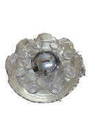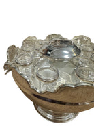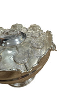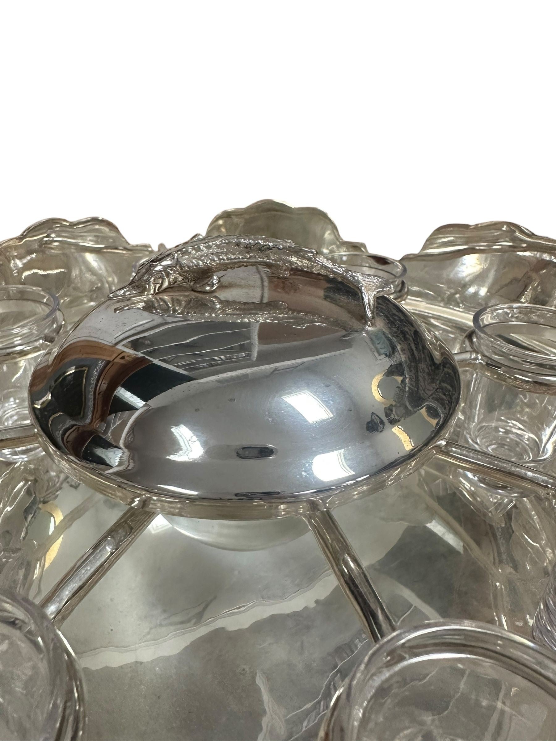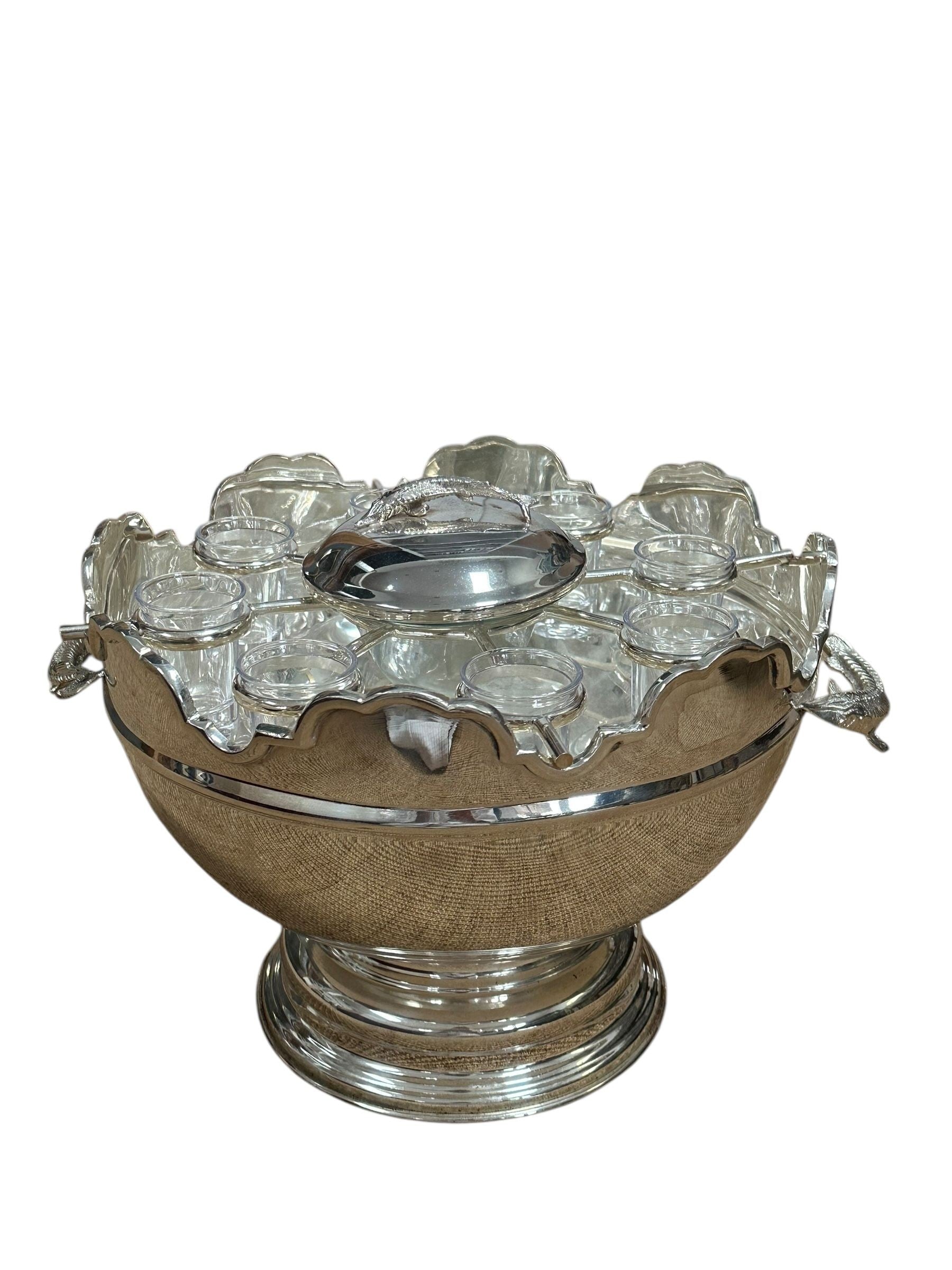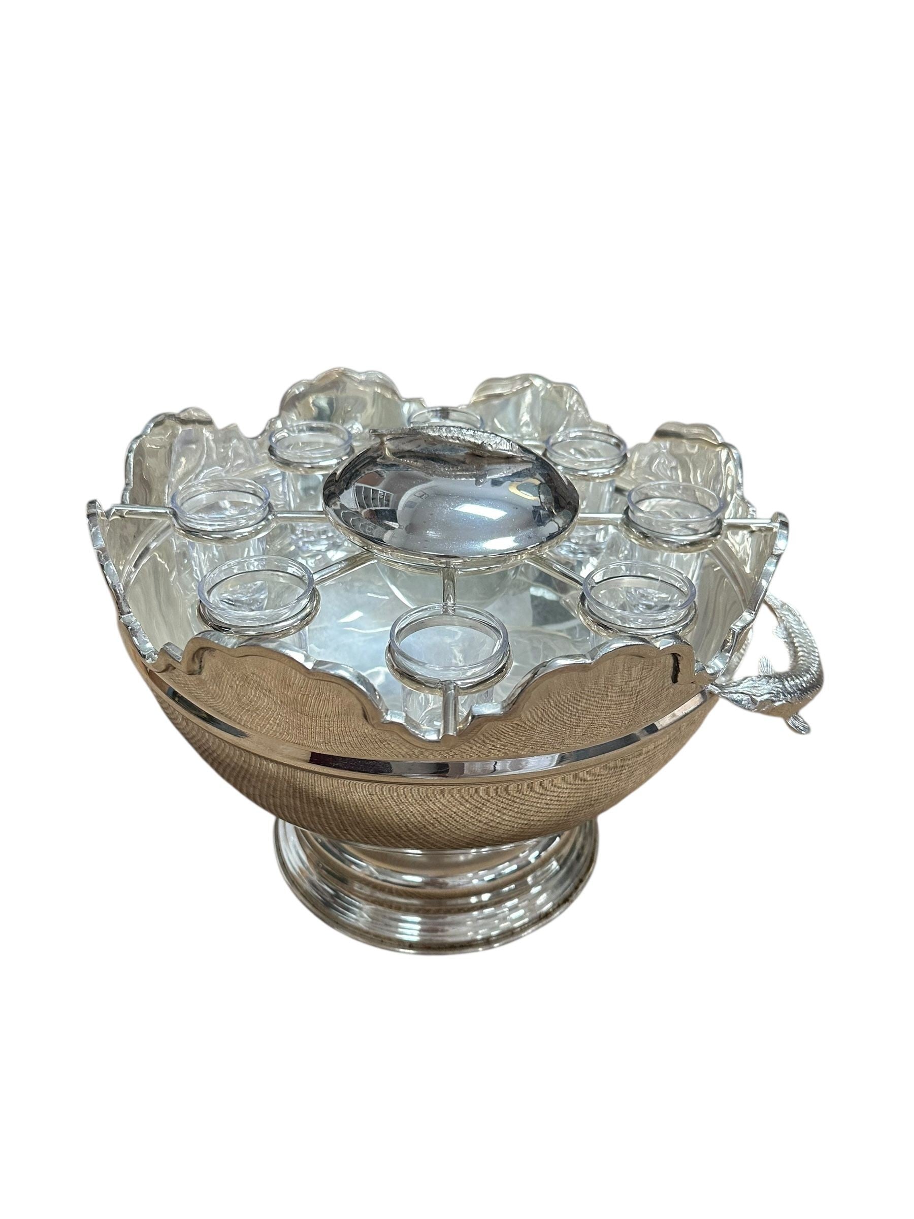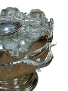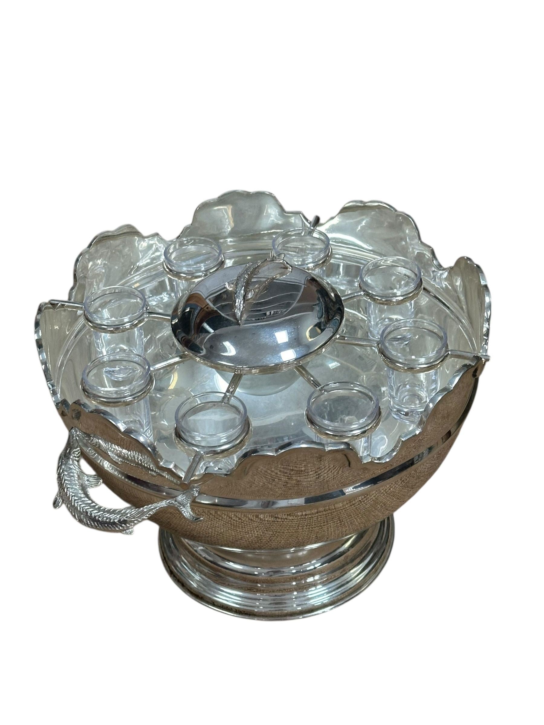 A striking vintage silverplate and glass Monteith bowl server designed for traditional caviar and vodka service. This sculptural piece features a removable molded glass insert with scalloped compartments surrounding a central lidded well, ideal for ice, condiments, or accompaniments. The silverplate base is beautifully modeled with sturgeon relief handles, a classic and symbolic motif associated with formal caviar service, and rests on a stepped pedestal foot that gives the piece strong architectural presence.