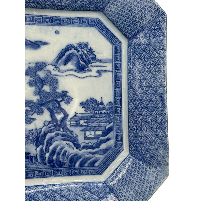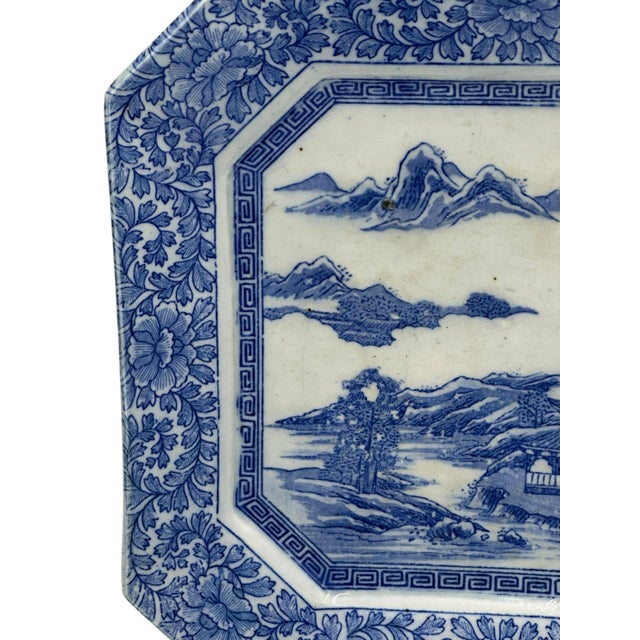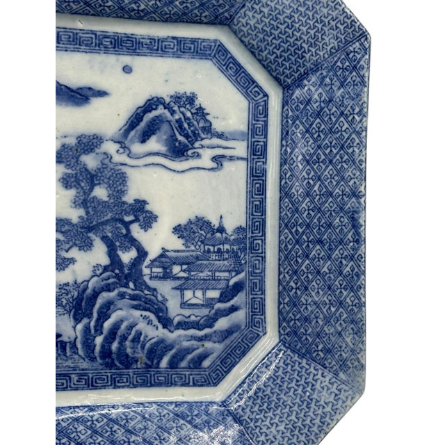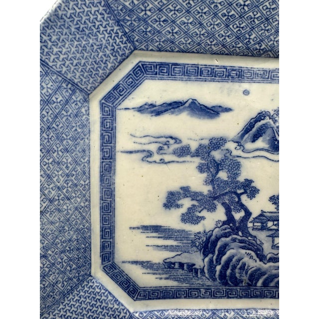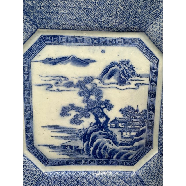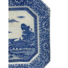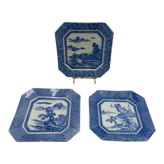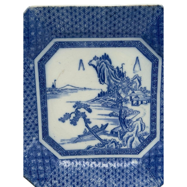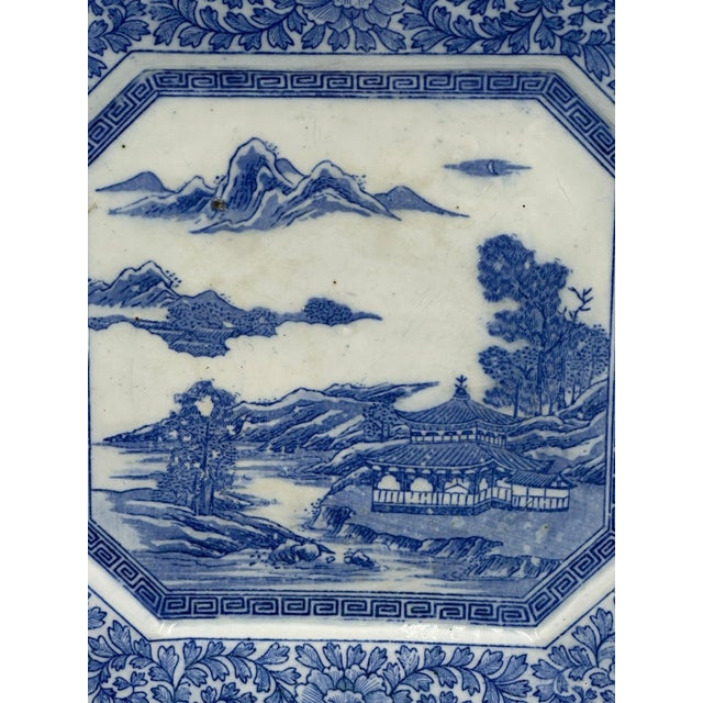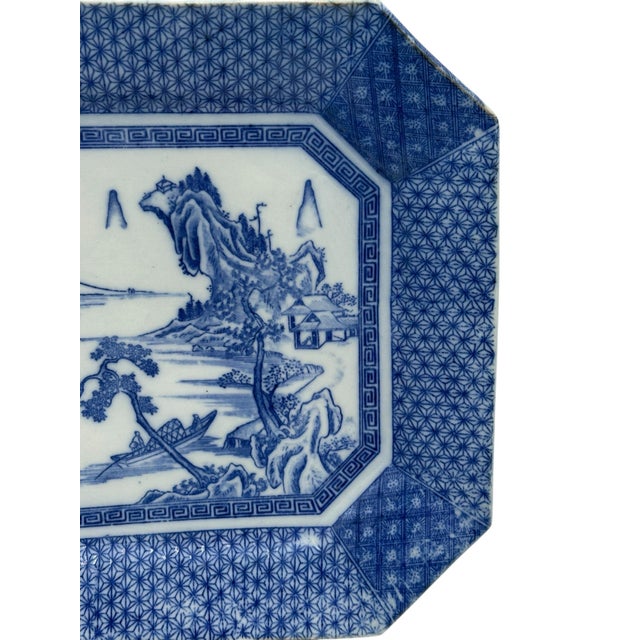 A beautiful trio of late Meiji Period blue and white octagonal serving platters, each featuring a distinct hand-painted landscape in rich cobalt tones. The cut-cornered silhouettes, textured borders, and serene pastoral scenes highlight the refined artistry of late-19th-century Japanese porcelain.