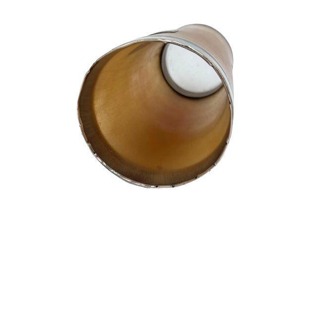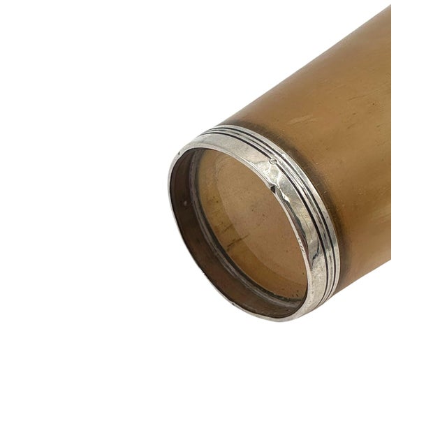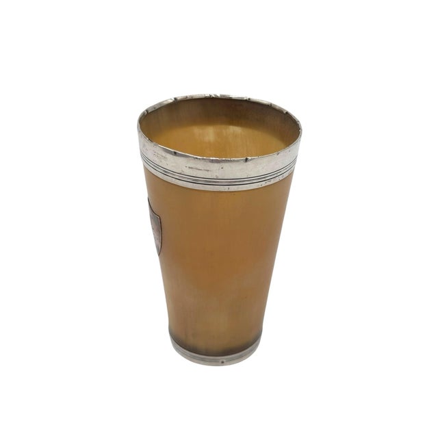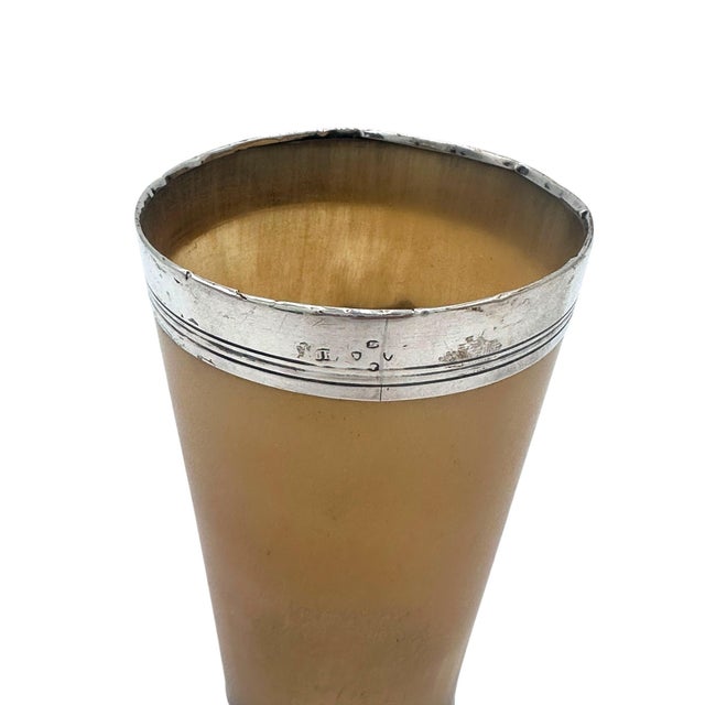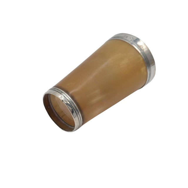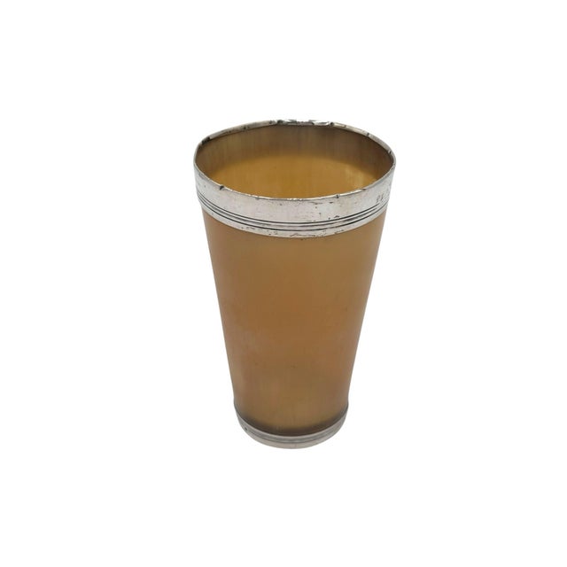 Tapered in form and measuring 2.75 inches wide by 4.5 inches high, the cup features a warm natural horn body elegantly banded with sterling silver at the rim and base.