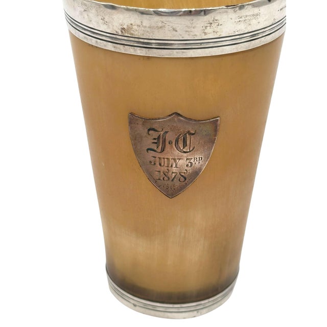 A shield-shaped silver cartouche engraved with the initials “J.C.” and dated “July 3rd, 1878” lends historical intrigue, suggesting it was likely a personal gift or presentation piece. The base is fitted with a clear glass bottom, a feature often found in hunting or ceremonial cups of the period. A handsome addition to any collection of antique barware or gentleman’s accessories.