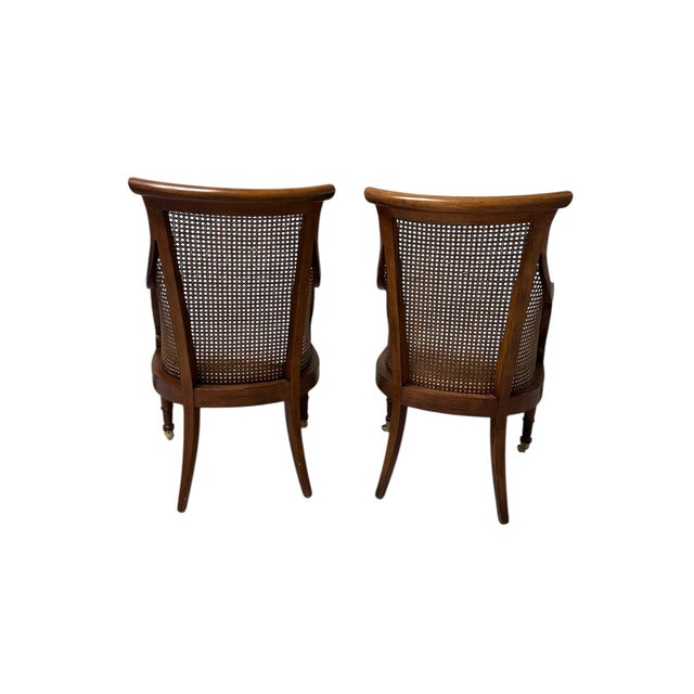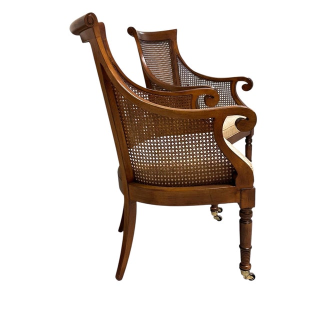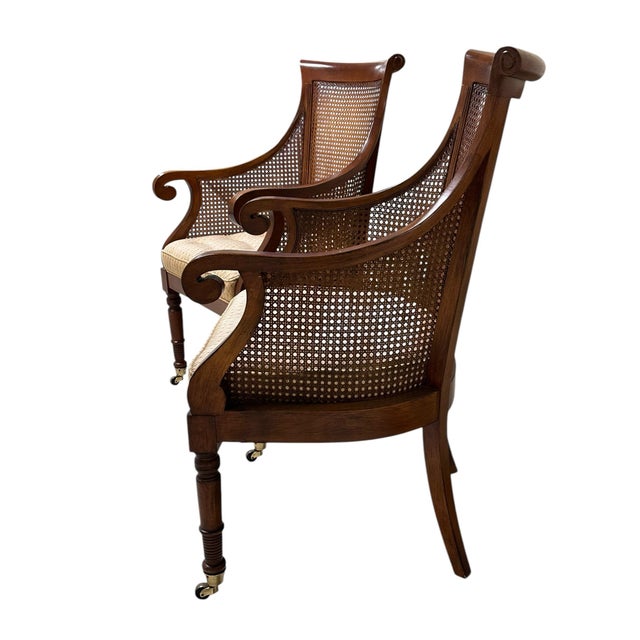 This pair of early Mid-Century Regency caned library chairs captures the essence of refined Regency design. The gracefully curved frames, carved legs, and intricately caned backs and sides bring a sense of lightness and texture to the design.