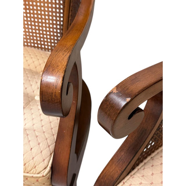 Pair is in excellent vintage condition. A small amount of wear to arms and frame that do not take away from beauty or function. A few light marks on upholstery. We want our customers to have complete satisfaction with their purchases. We endeavor to note any wear and tear to our pieces, but we encourage you to carefully and thoroughly review all photos. We consider product photos a part of our condition report and kindly request that you to inspect them carefully before your purchase.
