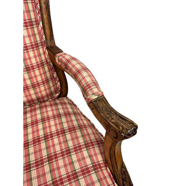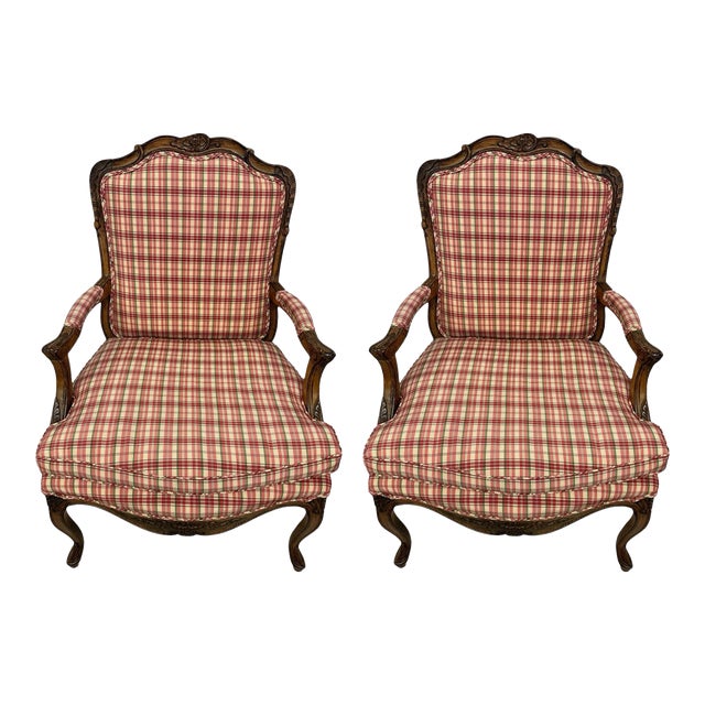 Pair of Late 20th Century French Country Louis XV Arm Chairs With Plaid Upholstery