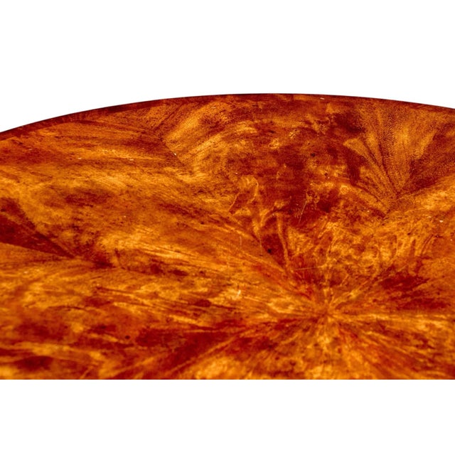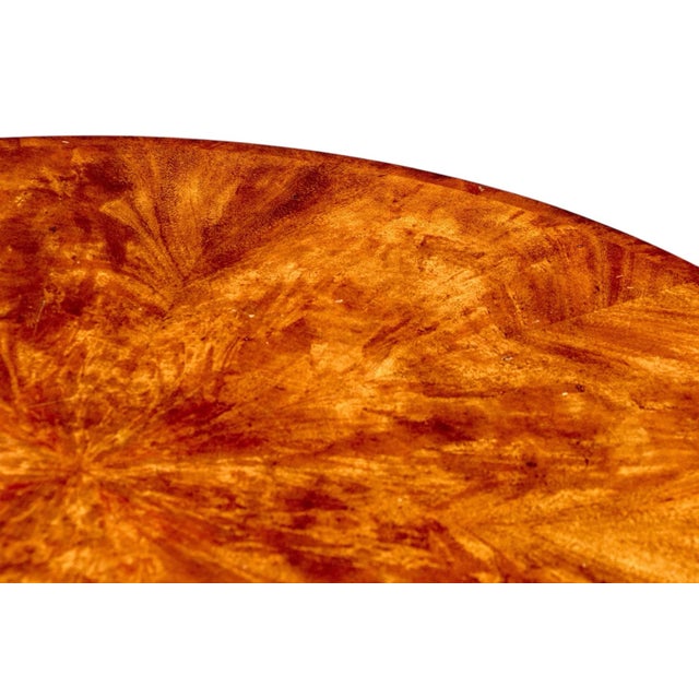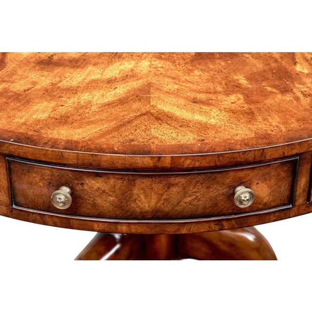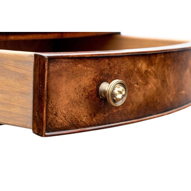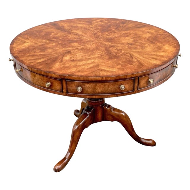 The tabletop showcases a striking flame mahogany veneer arranged in a radiant sunburst pattern, emphasizing the wood’s natural depth and luster. The apron features a series of drawers adorned with brass pulls, enhancing the piece’s classic elegance without interrupting its clean silhouette.
