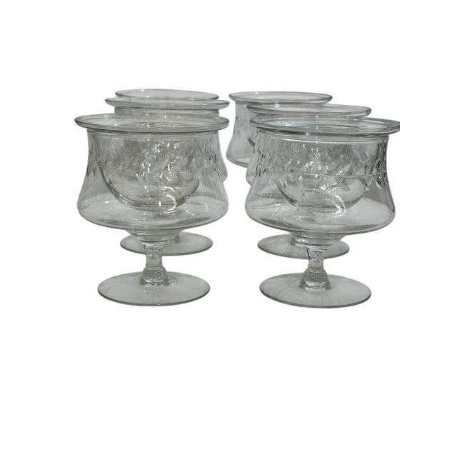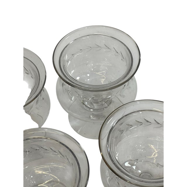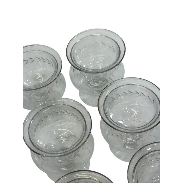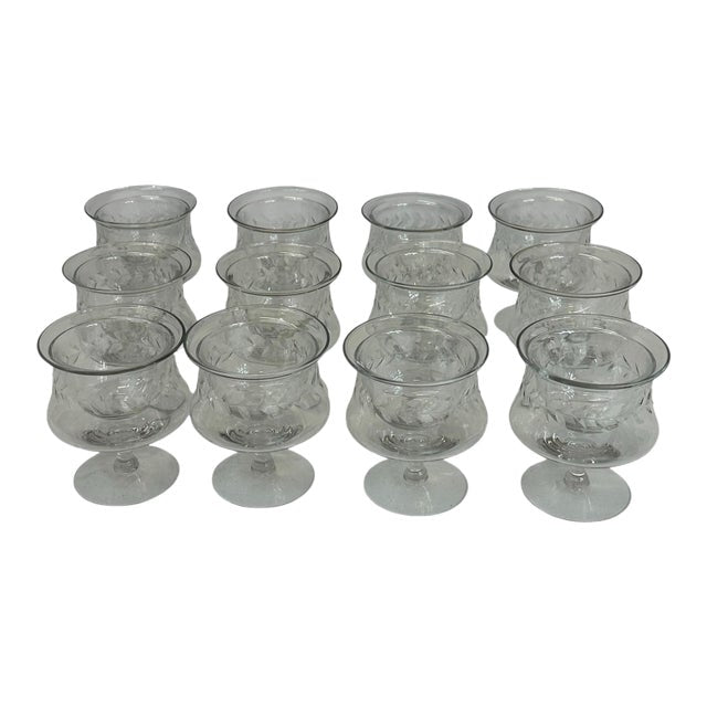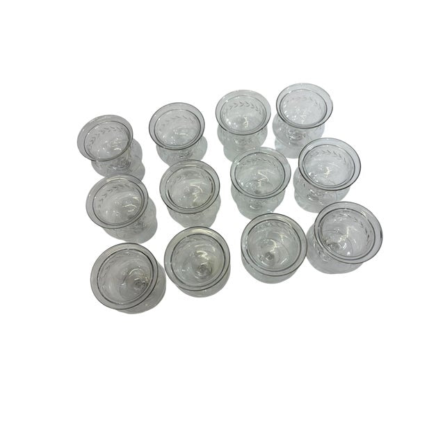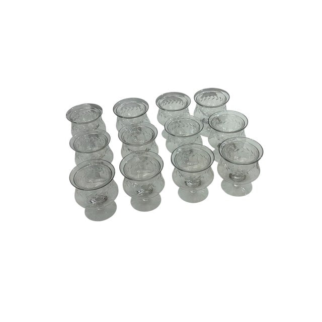 A beautiful set of twelve vintage crystal caviar and seafood servers, each crafted with a refined etched leaf motif and a gently flared rim that catches the light elegantly. These footed bowls are perfect for serving caviar over ice, seafood cocktails, shrimp, or individual hors d’oeuvres—adding a touch of timeless entertaining glamour to any table.