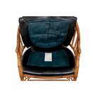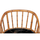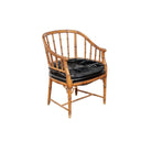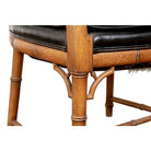 This Regency style chair features a faux bamboo frame with a rich brown finish. The seat cushion is expertly upholstered in solid black leather, a striking contrast to the ornate nature of the faux bamboo.