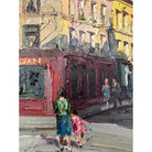 This painting features a french cityscape. The painting depicts many characters, including a woman and child walking hand-in-hand, a woman with a small black dog, a couple holding hands and a woman in a blue suit on her way to work. The street is filled with colorful, traditional shutter-adorned apartments and shops.
