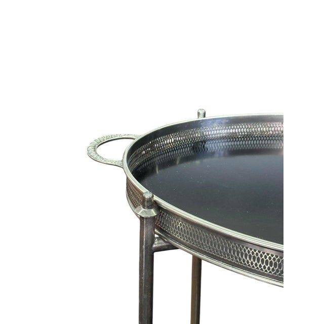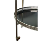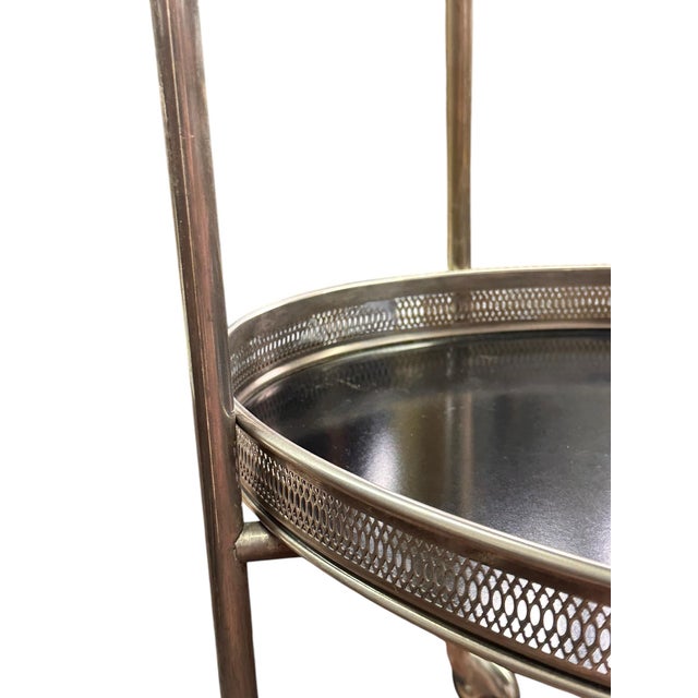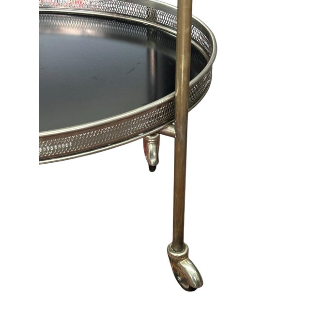 The cart features two sleek black Formica trays that provide a chic, minimalist contrast to the polished nickel frame. The trays are spacious and durable, making them perfect for displaying glassware, bottles, or serving essentials. Set on smooth-rolling casters, the cart offers both mobility and style, making it an ideal addition for entertaining or as a statement piece in your home.