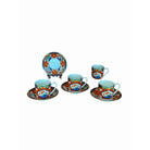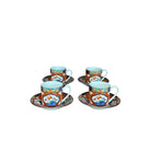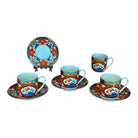 This set features beautiful floral motifs. Each saucer features four scenes: cherry blossom trees, roses, bamboo and Japanese maples atop green islands surrounded by blue waves. The espresso cups feature two identical scenes of cherry blossoms. Each vignette is surrounded by additional scenes of flowers and leaves.
