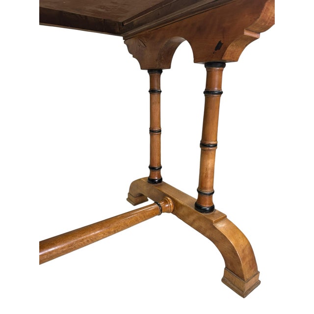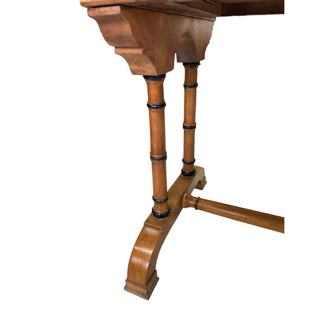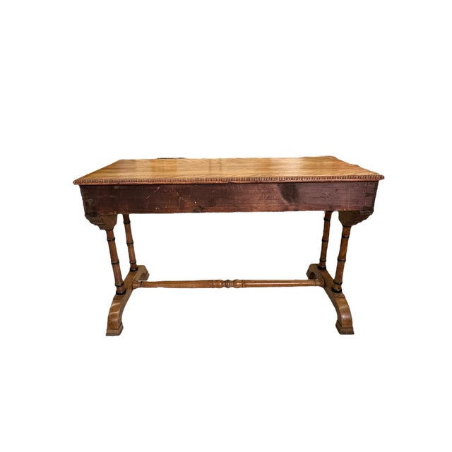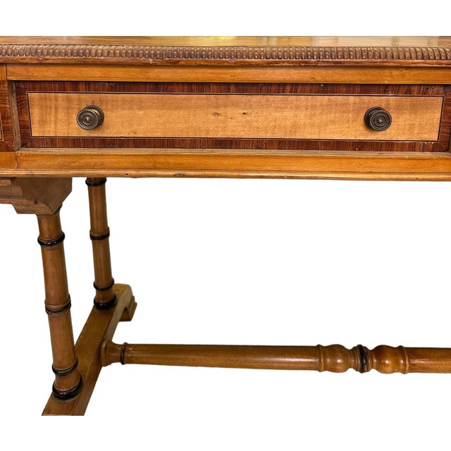 This antique desk features elegant lines and beautiful, simple marquetry. The desk drawers feature a dark tulipwood marquetry and round brass pulls. The legs are a wonderful carved faux bamboo.