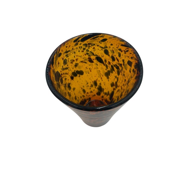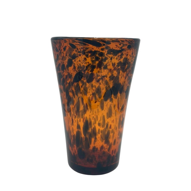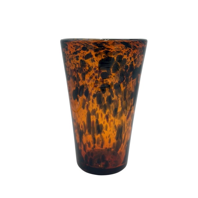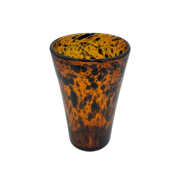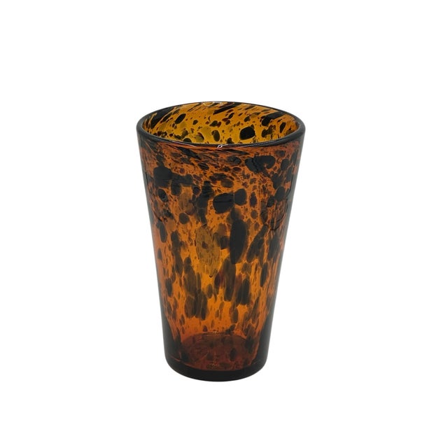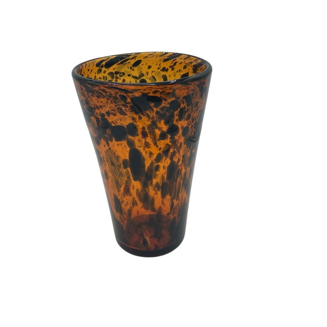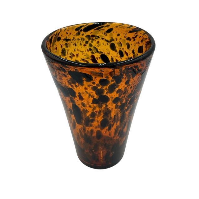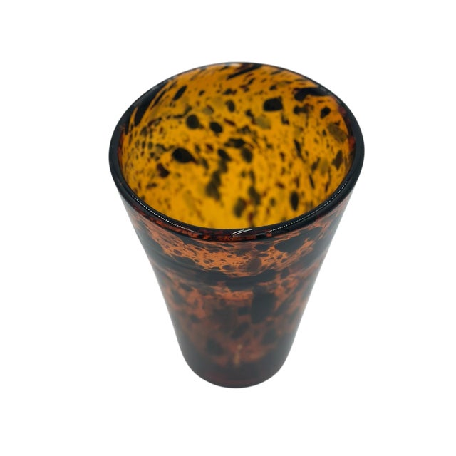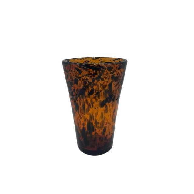 A striking and sculptural AERIN tortoise glass vase in rich amber and espresso tones, showcasing the timeless allure of glass craftsmanship. The vase captures and reflects the light beautifully. The mottled tortoiseshell pattern lends a sense of Ralph Lauren–style sophistication, blending modern classic elegance with a nod to transitional interiors.