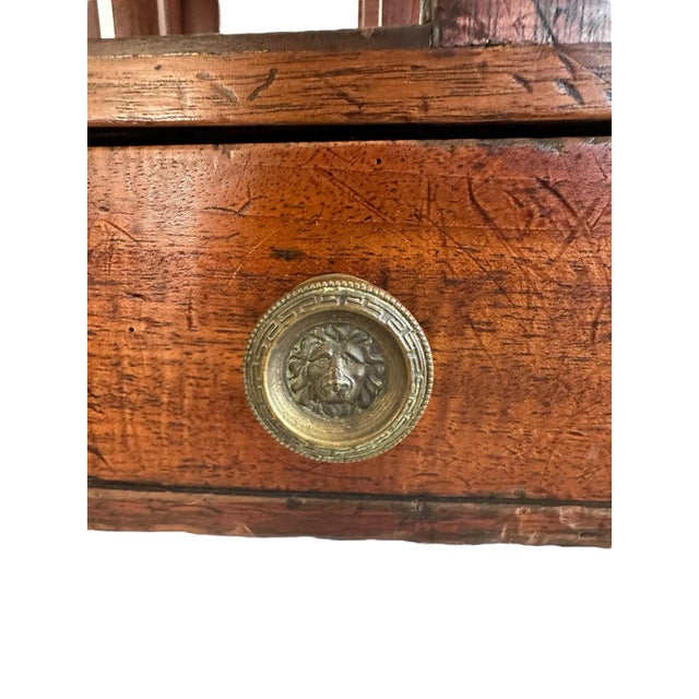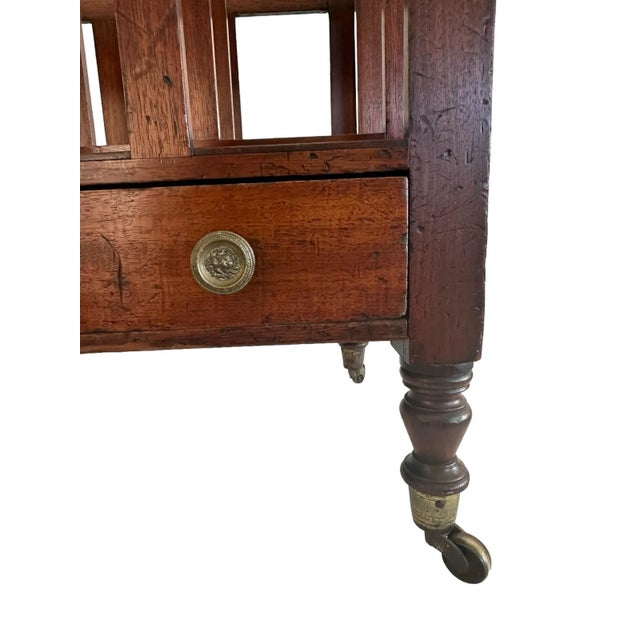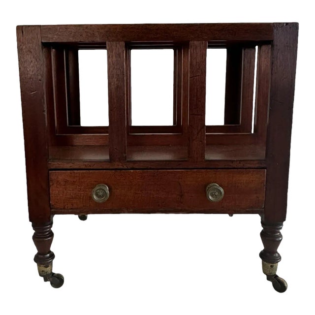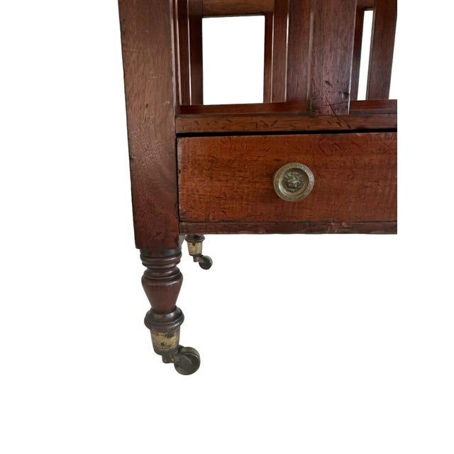 This beautiful 19th century canterbury features its original hardware and castors. The original drawer handles feature lion motifs. The wood has aged wonderfully and the mahogany is a warm, rich brown.