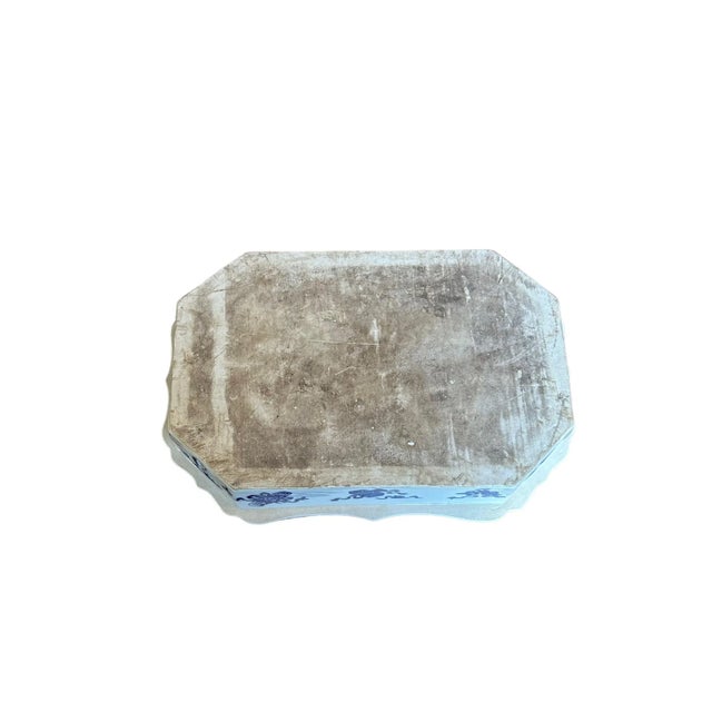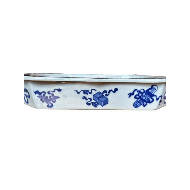 Elevate your dining experience with this Chinoiserie Blue and White Warming Dish, adorned with a captivating Pagoda Scene. This warming dish is double walled, and delicate cutout details can be seen on the corners of the sides. The sides also feature an array an array of blue and white, jars, vases and urns wrapped in ribbons.