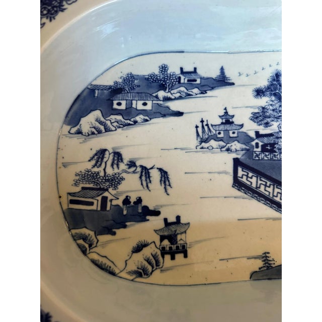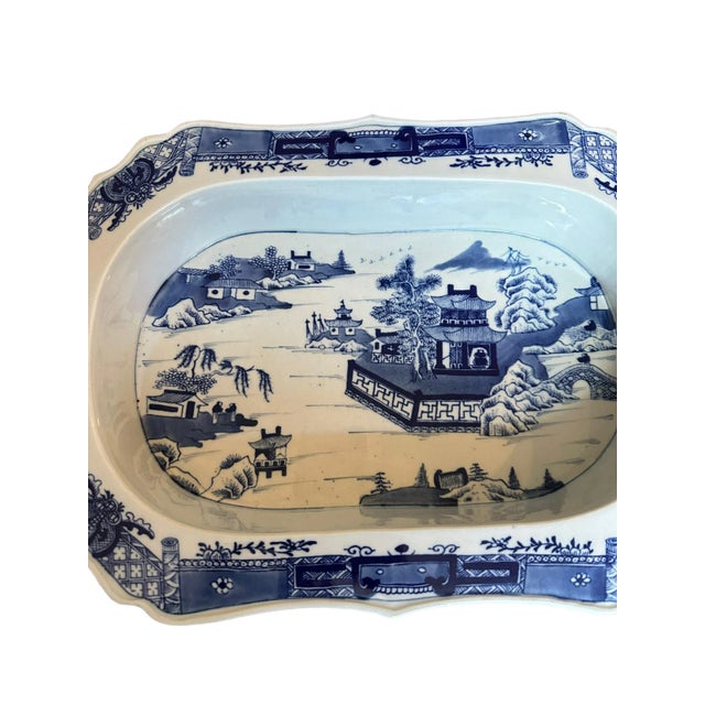 Antique Blue and White Chinoiserie Warming Dish With Pagoda Scenes