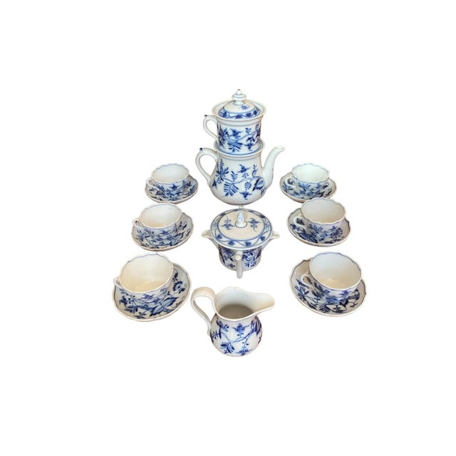 Beautiful antique set of 6 cups and 6 saucers by Meissen Teichert in a traditional blue onion pattern. Teapot and creamers sold separately.