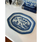 This antique Chinese blue and white octagonal porcelain platter showcases the refined artistry of traditional Chinese porcelain, featuring intricate blue botanical and pagoda scenes on a pristine white background.