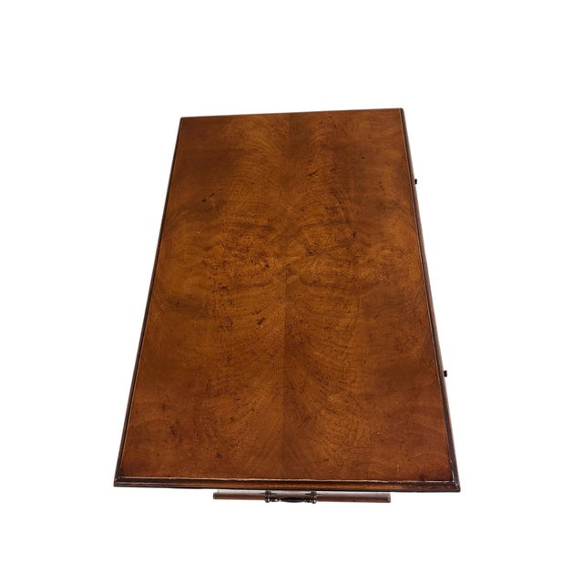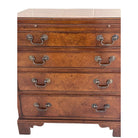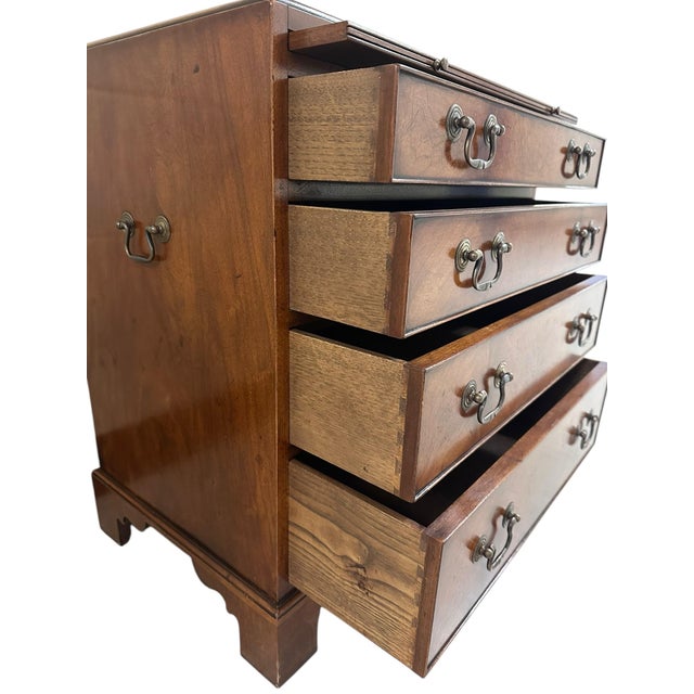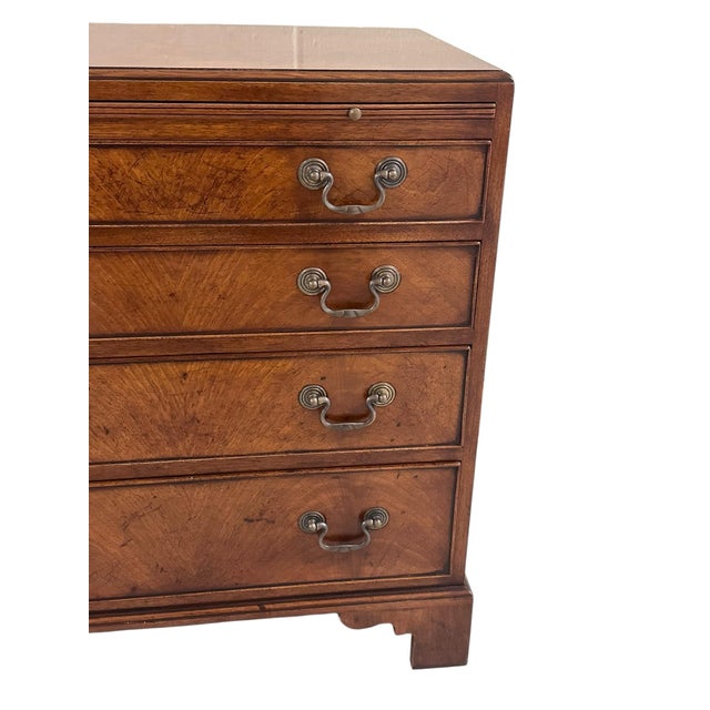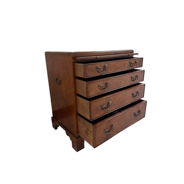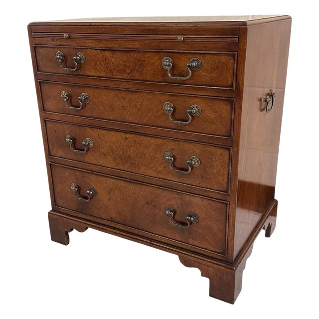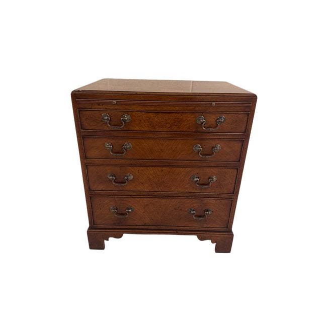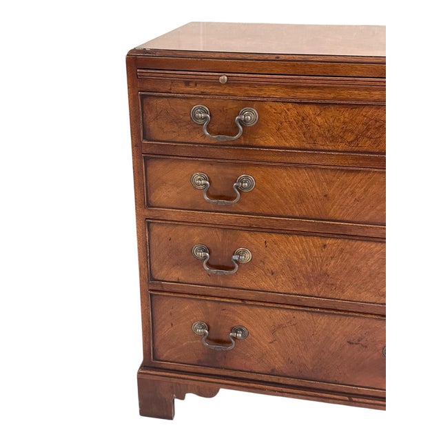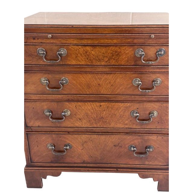 This beautiful bachelors chest features a luscious amber colored flame mahogany and naturally aged brass hardware. There are four drawers and a large pullout drawer. The drawers are expertly crafted with sturdy dovetail joints.