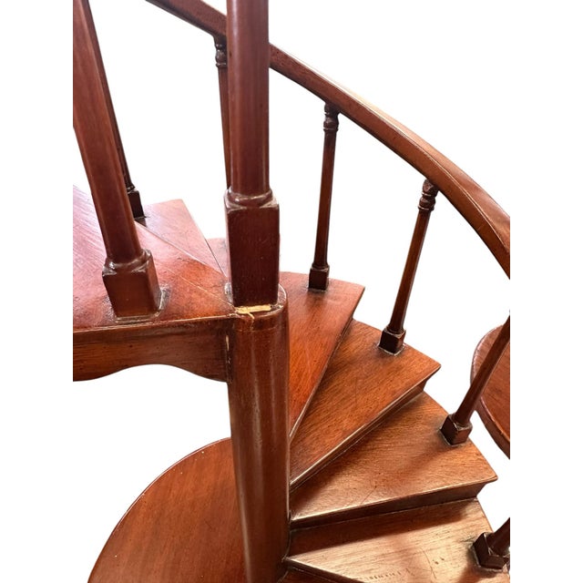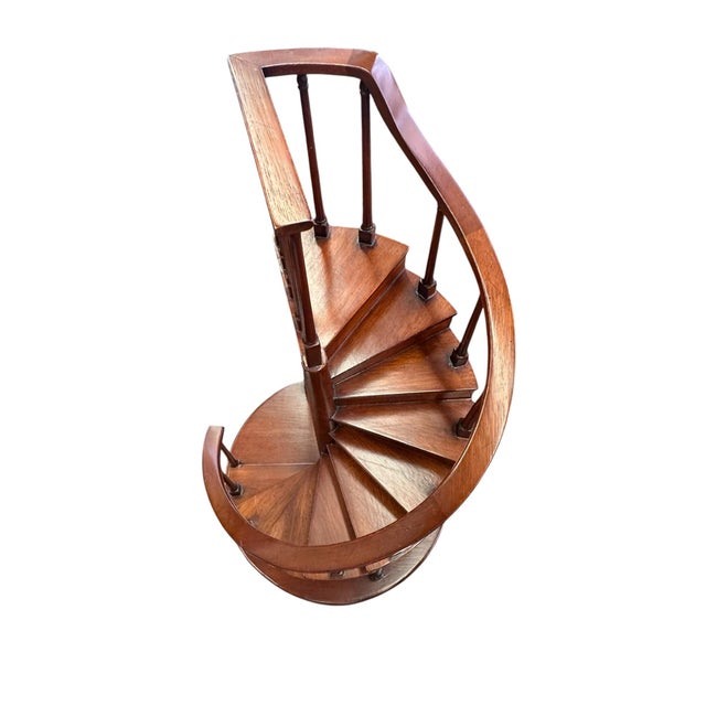 Crafted from rich mahogany with a warm, aged patina, this model captures the elegance and ingenuity of spiral staircases, often seen in grand homes, lighthouses, or industrial settings. The craftsmanship is evident in every detail, from the meticulously turned spindles to the smooth curvature of the steps.
