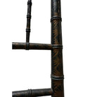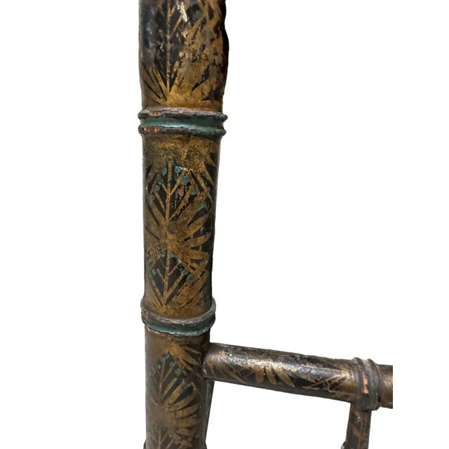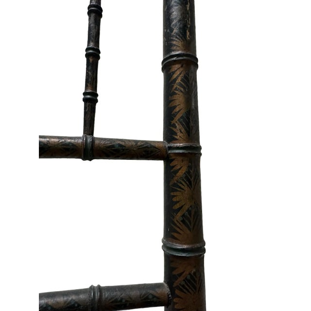 This antique pair of petite chairs showcases an exquisite design featuring black faux bamboo frames. Each chair is hand-painted with gilded accents. The decorative elements include delicate botanical motifs and elegant patterns, adding a touch of sophistication and charm.