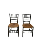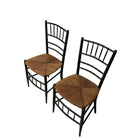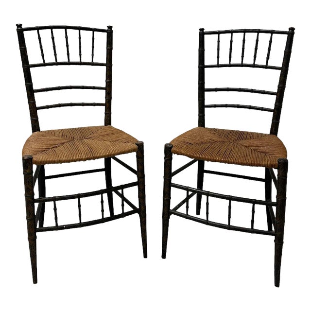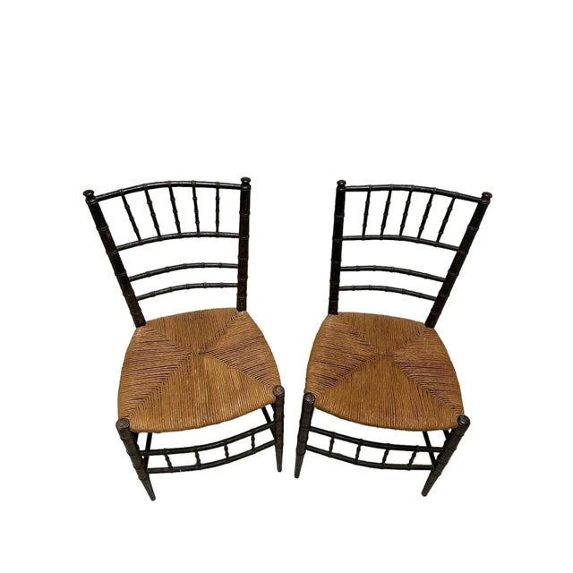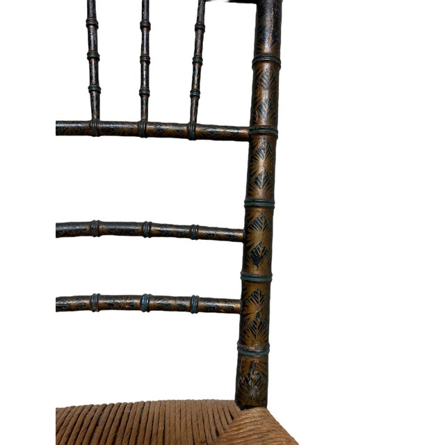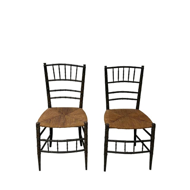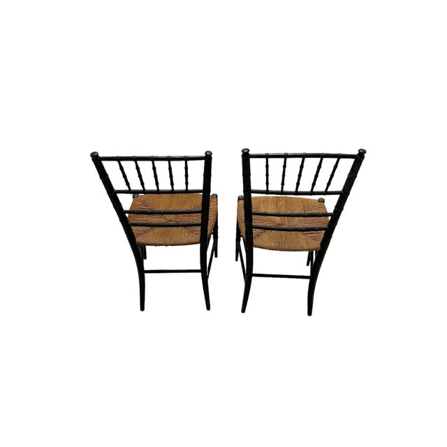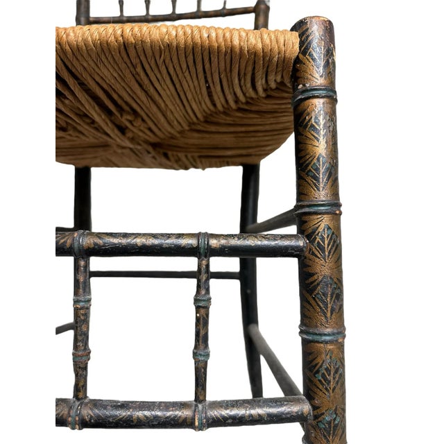 Antique Pair of Asian Petite Black Faux Bamboo Decorative Hand-Painted Gilded Chairs With Rush Seats