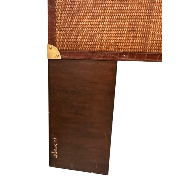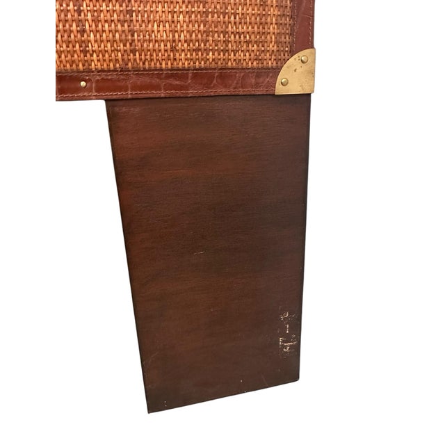 Expertly crafted, the piece features a rich mahogany frame accented by handwoven rattan panels, wrapped in full-grain leather trim with hand-applied brass corner caps — hallmarks of the brand’s celebrated British-colonial aesthetic. The arched silhouette brings an architectural element to the design, while a subtle brass emblem at the center adds a refined finishing touch.