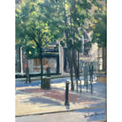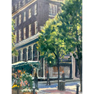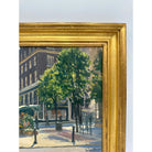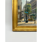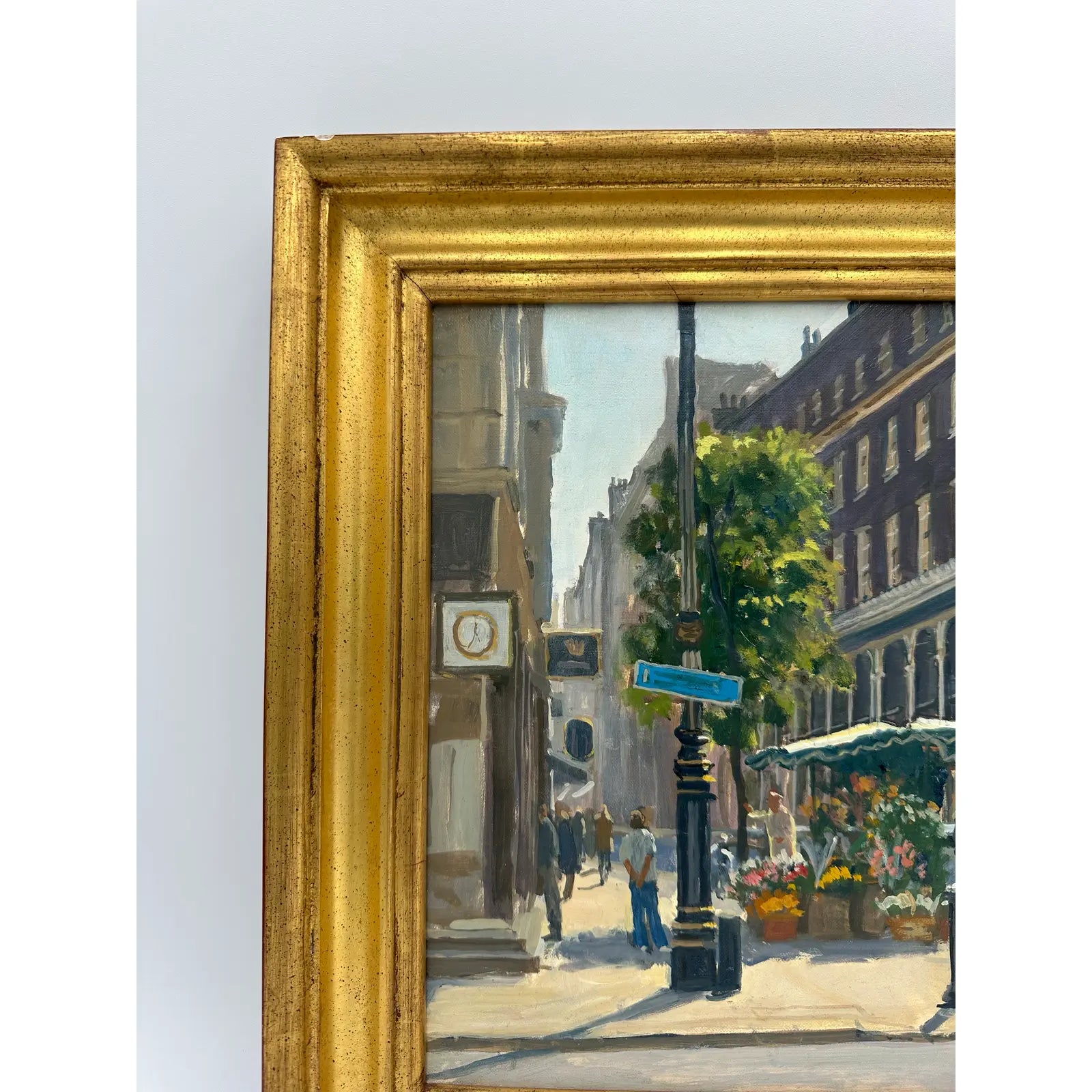 This incredible oil painting depicts a flower stand on Bond Street, one of London's most famous streets. Situated in front of a beautiful brick building, the flower stall has an assortment of pink, red, yellow and white flowers. Men and women can be seen walking along the storefronts and nearby pub. The trees are in a full spring bloom.