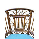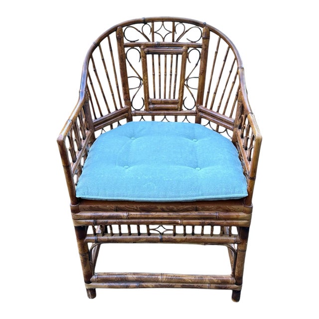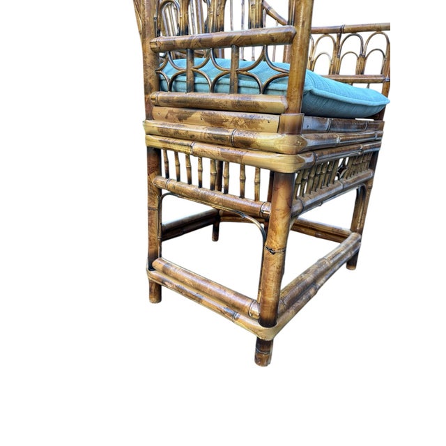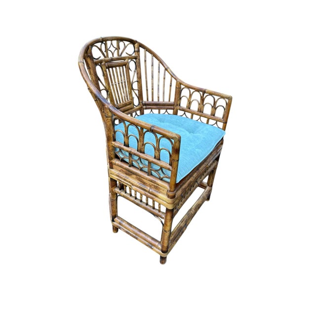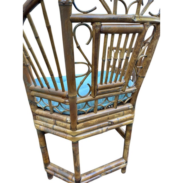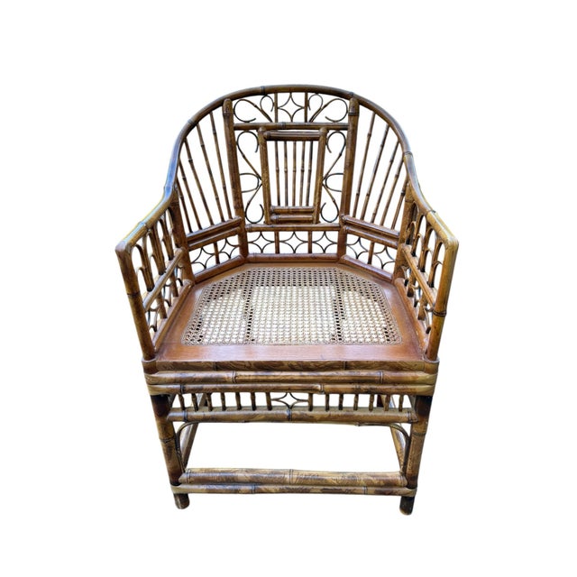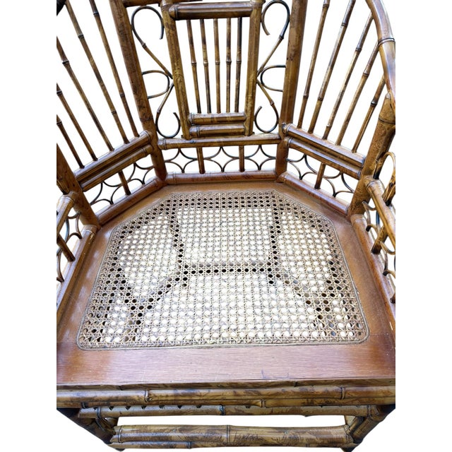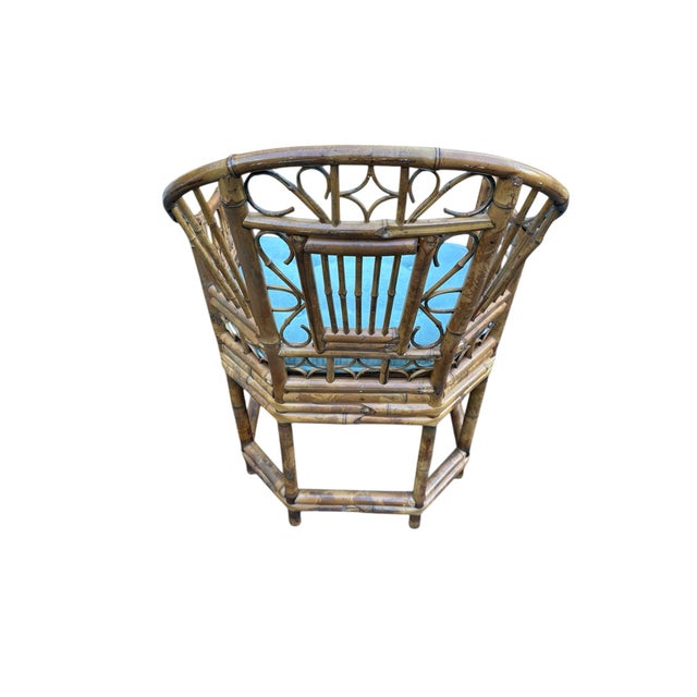 The scorched bamboo chair features a horseshoe shaped frame along with delicate, geometric fretwork. The caning is in very good condition.