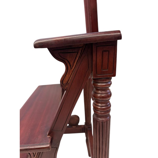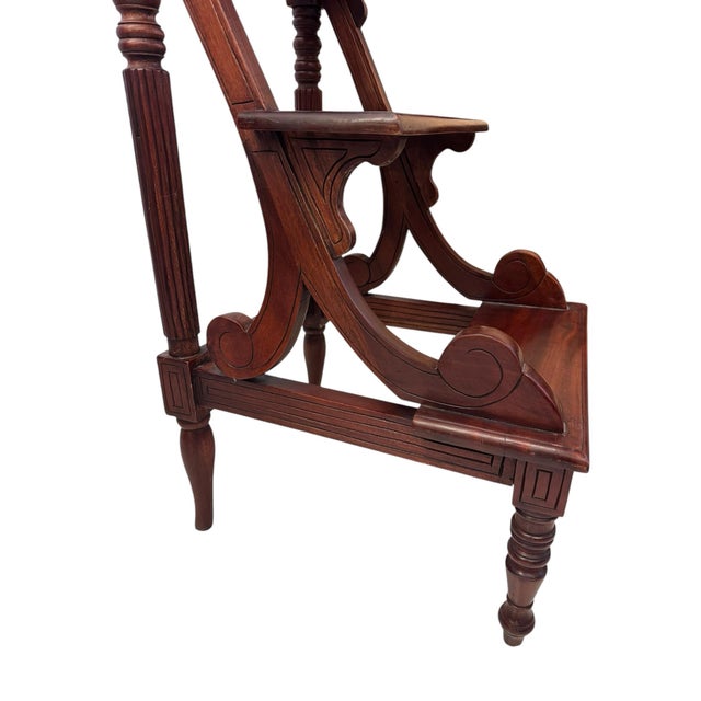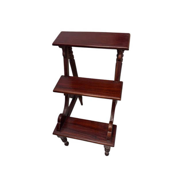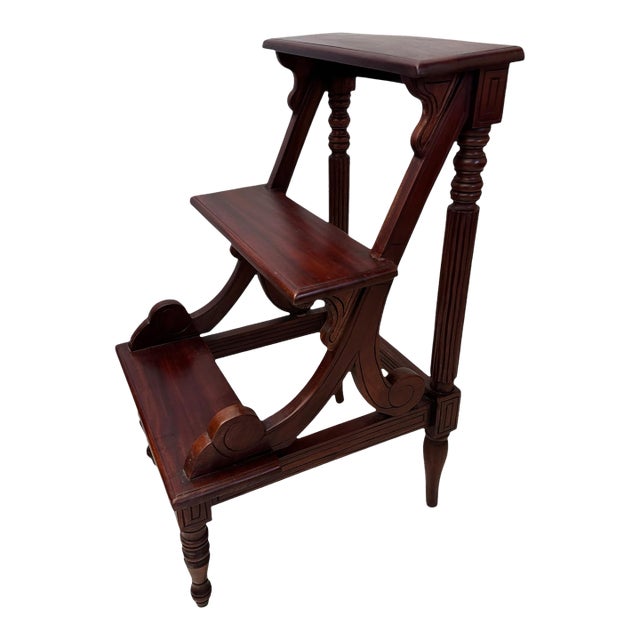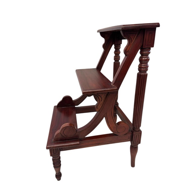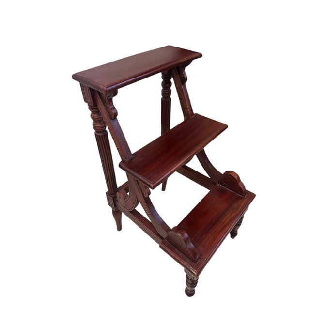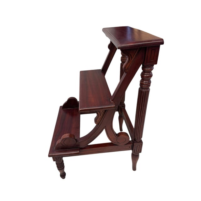 A beautifully crafted early 20th-century Regency style mahogany library steps. This elegant piece features three graduated steps with gracefully curved supports and turned baluster legs. Perfect for adding a stately touch to a home library, study, or living space, whether used functionally or as a decorative accent.