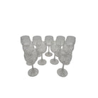 This timeless set of 11 Rock Sharpe Atlantis crystal wine glasses features a refined crystal cut pattern and delicate floral motifs, complemented by square stepped beaded stems for a balanced silhouette.