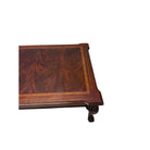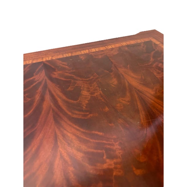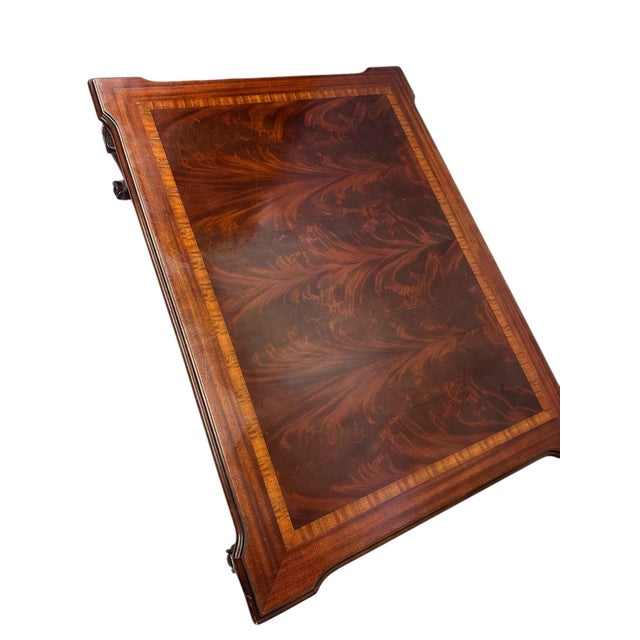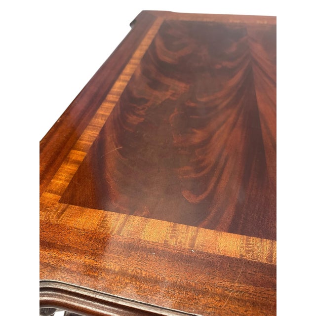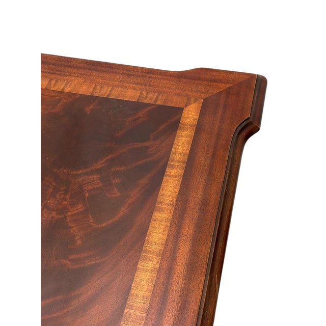 A stunning statement piece, this Chippendale-style cocktail table attributed to Thomasville showcases the timeless beauty of flame mahogany. The rectangular tabletop boasts a dramatic bookmatched flame mahogany veneer, elegantly framed with a contrasting satinwood inlay for added depth and dimension. The beveled edges and sculptural corners add refinement to its classic silhouette.