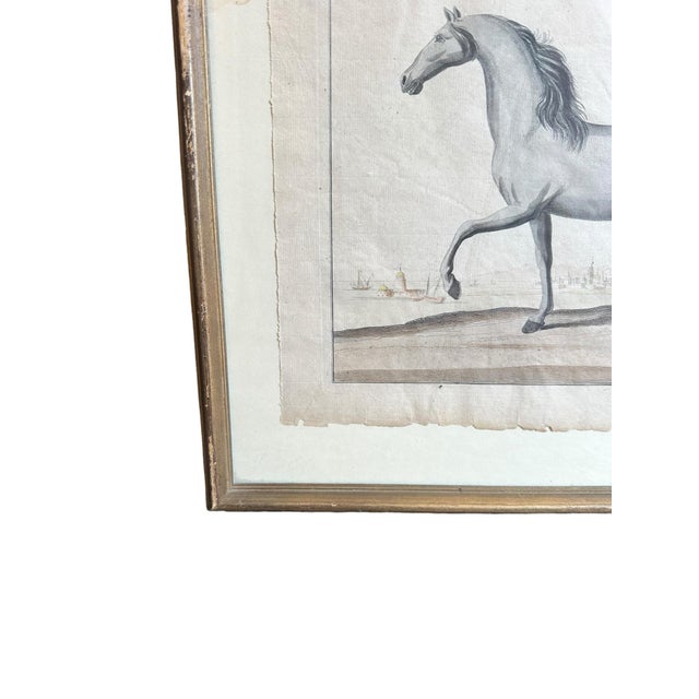 This hand-painted mid-18th century engraving by Bernard Picart, titled Le Turc, is a captivating portrayal of a gray horse in motion, set against a serene backdrop of a castle and waterway. Marked Le Turc in the upper right corner.