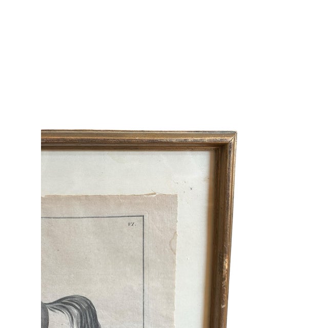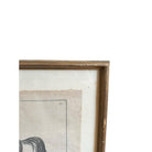 The engraving is professionally framed in a gold-toned wooden frame with a charmingly worn patina that complements the artwork’s historic character. Measuring approximately 14 x 17.25 inches (10 x 13.75 inches for the artwork itself), the piece shows some wear to the frame, enhancing its antique appeal.