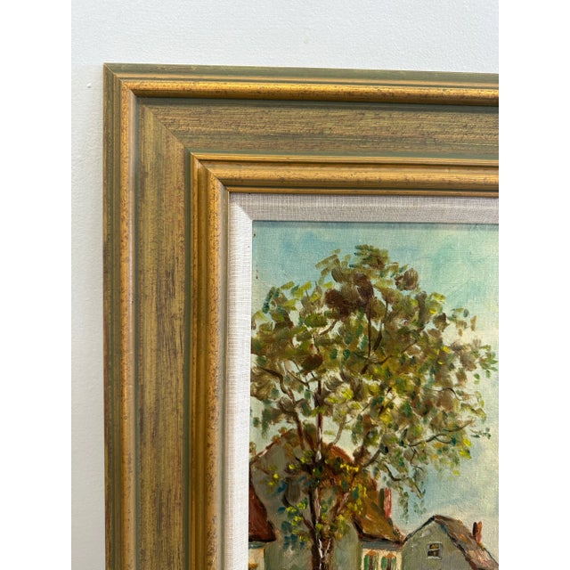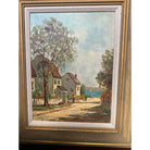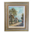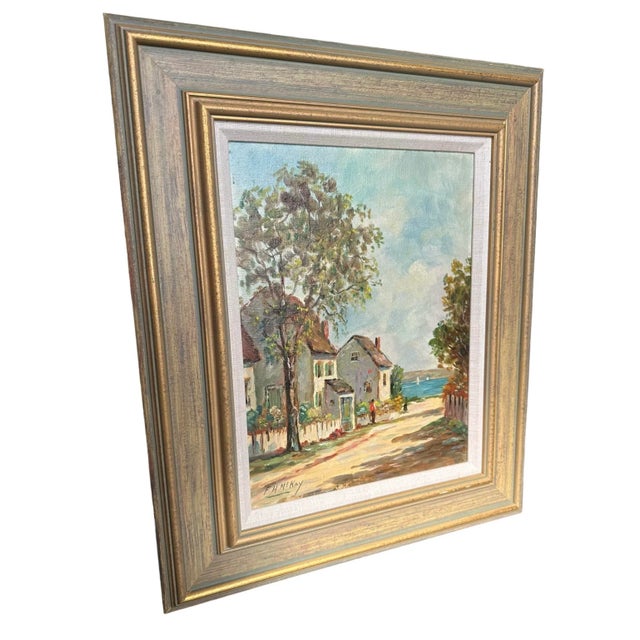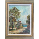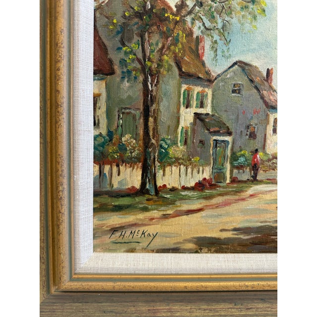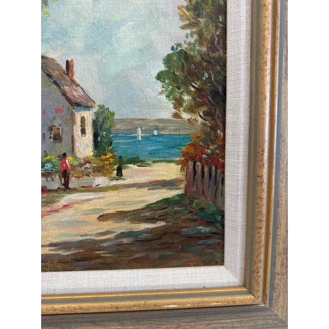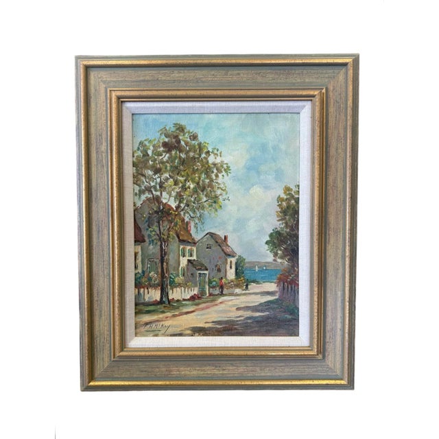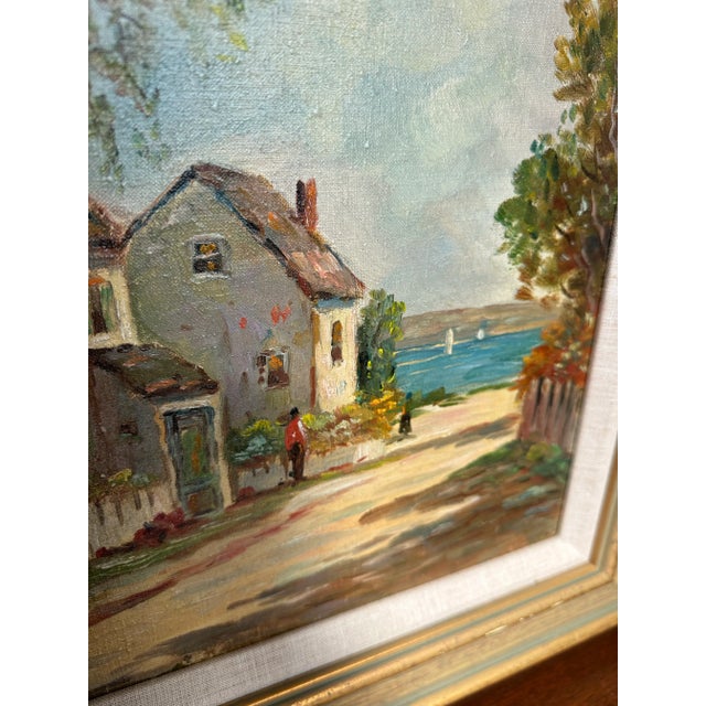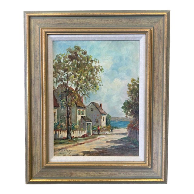 This late early 20th century oil seascape by Frances H McKay features several cottages along a lane leading to the sea. The houses are surrounded by white picket fences, green grass and trees. Several figures can be seen waling to the harbor filled with small white sailboats.