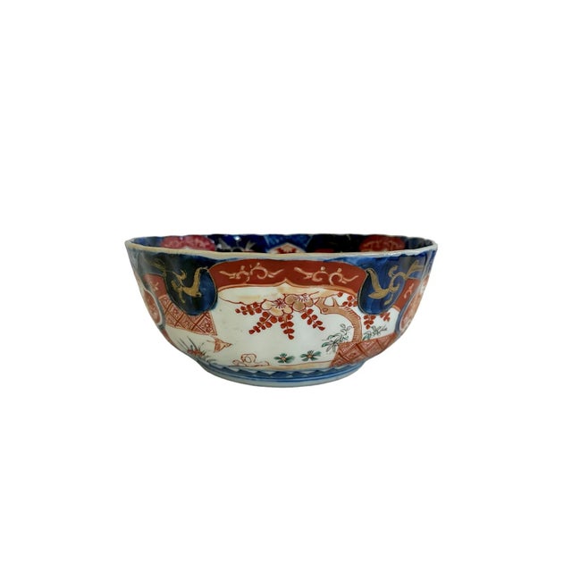 This bowl features a scalloped edge and a classic red, blue, yellow and white Imari color scheme. Bird, botanicals, waves, flowers and detailed scrolling designs make up the intricate pattern on both the inside and outside of this antique bowl.