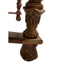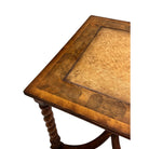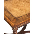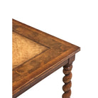 Thoughtfully designed, this table features a convenient pull-out slide for additional surface space. The barley twist columns, hand-carved details, and intersecting horseshoe stretcher base reflect classic European influences, making this piece a sophisticated addition to any living room, study, or bedroom.