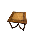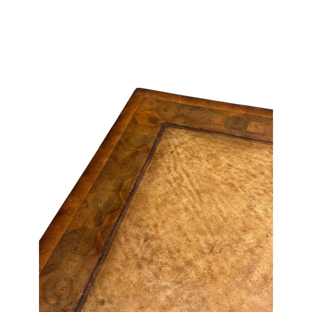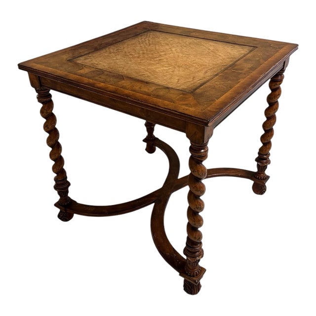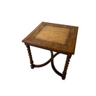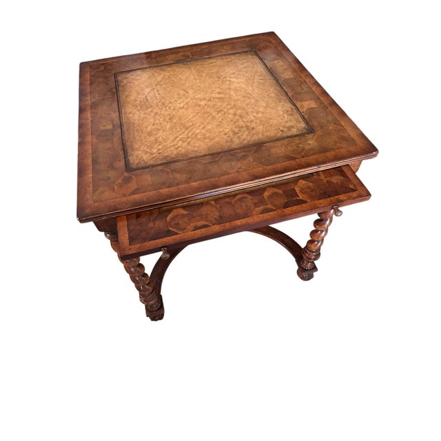 Elegant and expertly crafted, this Jonathan Charles square side table is a stunning example of fine furniture design. Made from walnut with a rich oyster veneer, it showcases intricate craftsmanship and luxurious materials. The inset tan leather top adds a refined touch, perfect for placing a lamp, books, or decorative accents.