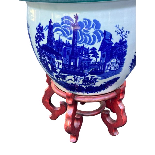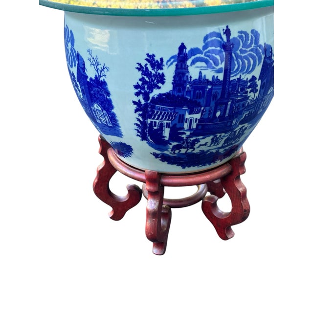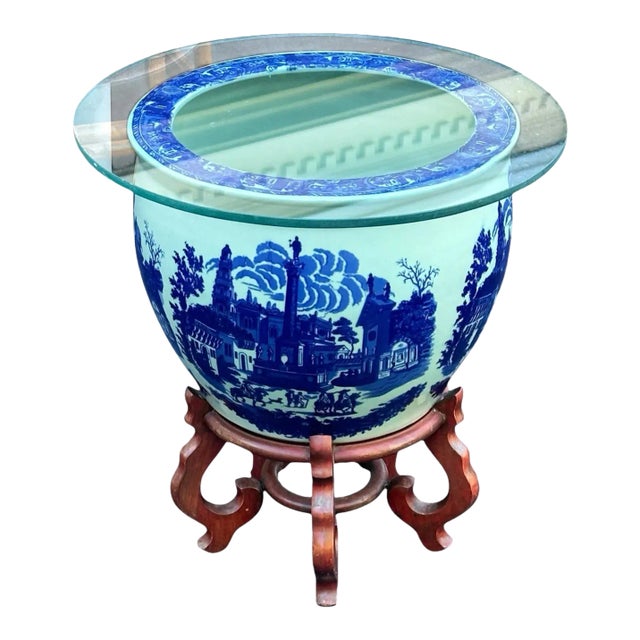 Large Blue and White Victoria Ware Ironstone Glass Topped Jardiniere Side Table