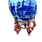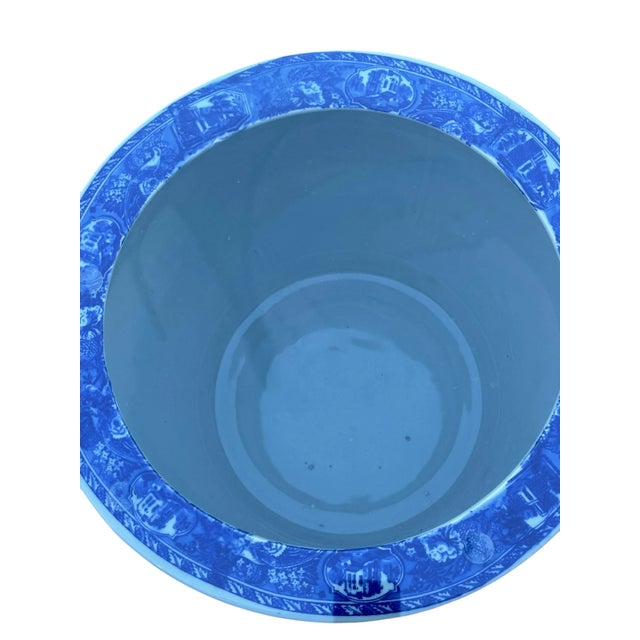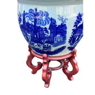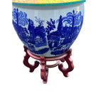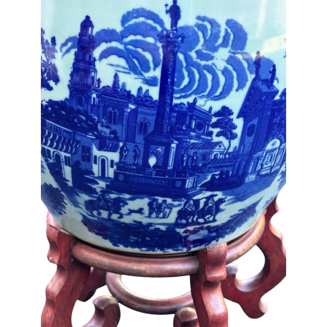 This exquisite blue and white Victoria Ware ironstone jardiniere table features a cobalt blue victorian cityscape. People can be seen in a town square on horseback against a crisp white backdrop.