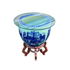Topped with a glass surface and resting on classic asian inspired pot / fishbowl stand, the jardiniere transforms into a versatile table perfect for use as a side table or decorative accent. House-ready.