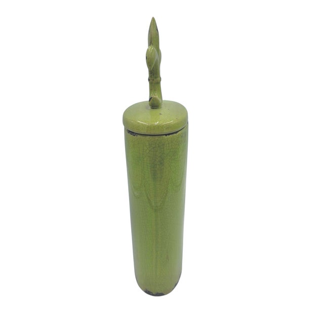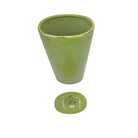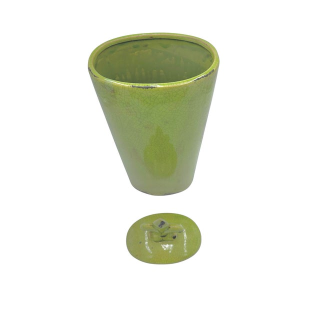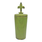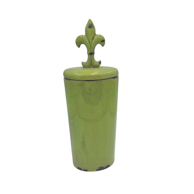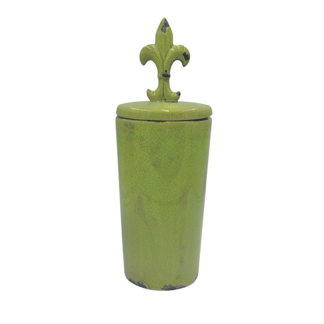 This large lidded jar features a chartreuse crackle glaze with a fleur-de-lis lid, offering a bold and sophisticated look. The textured crackle finish enhances the vibrant color, while the fleur-de-lis motif adds a classic touch to any space.
