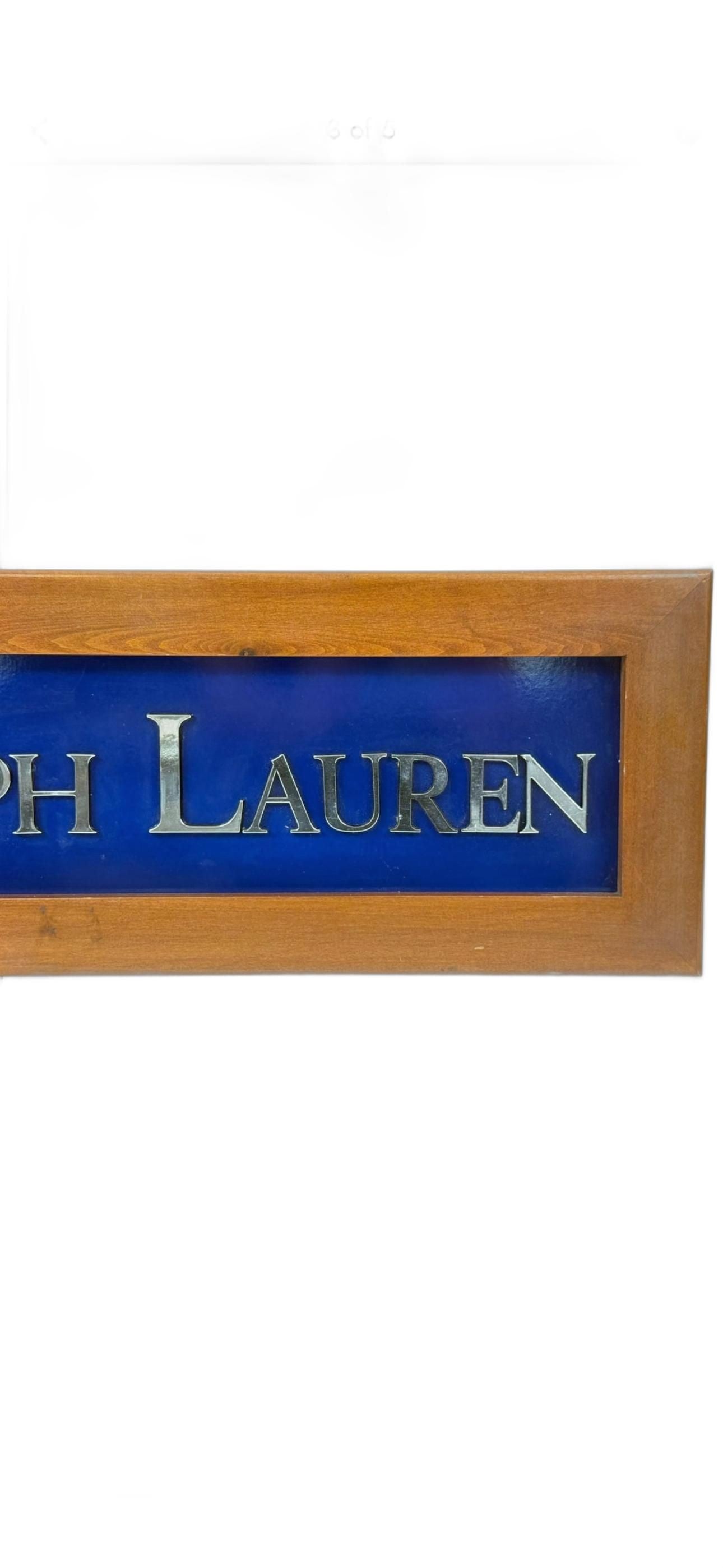 A large vintage Ralph Lauren retail display sign, originally used in-store and representative of the brand’s visual merchandising history. The raised metallic lettering set against a deep cobalt blue ground and framed in warm wood reflects Ralph Lauren’s classic retail identity from the late 20th century. Increasingly collected as fashion archive ephemera, this sign offers an authentic glimpse into the early lifestyle branding that defined Ralph Lauren beyond clothing.