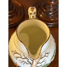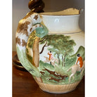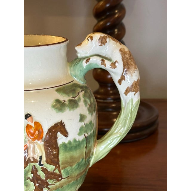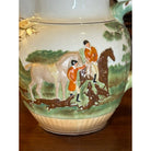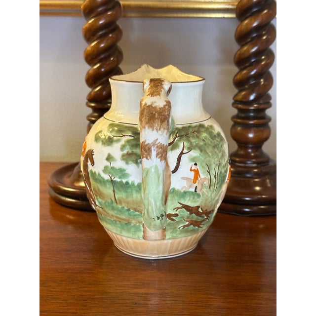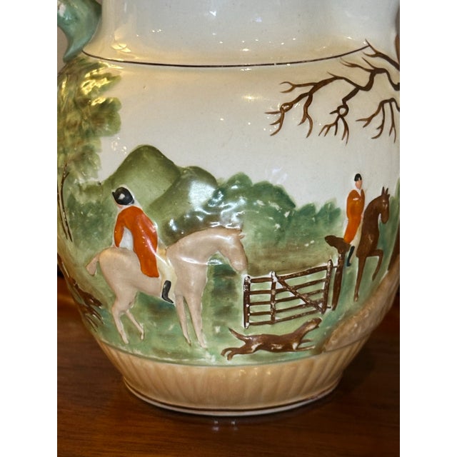 The motif on the pitcher features men in red jackets on a fox hunt. In a bucolic scene, the men ride in a paddock with their fox hunting hounds and horses. The handle of the pitcher is in the shape of a spotted hound, and when you look at the pitcher face on, it almost appears the hound is peaking out from the other side of the pitcher.