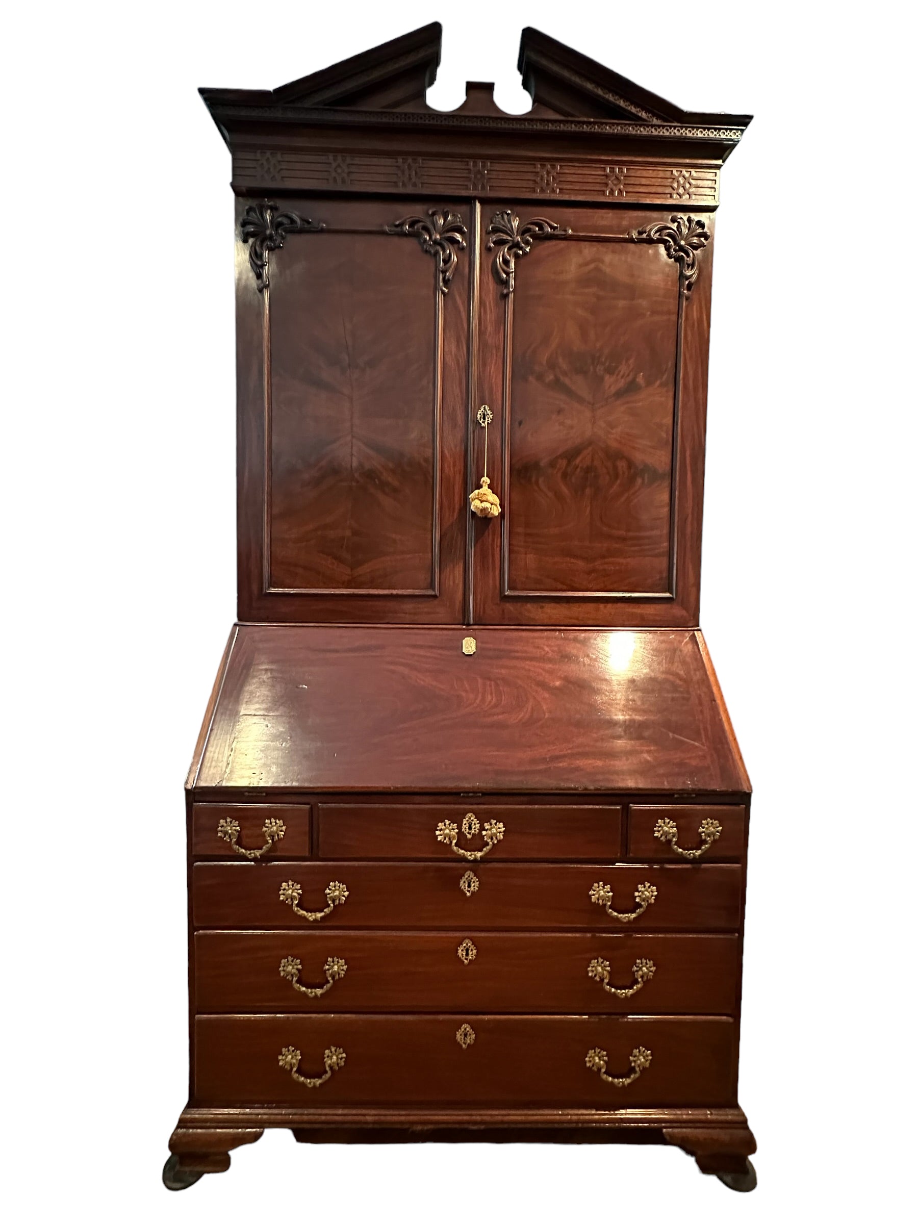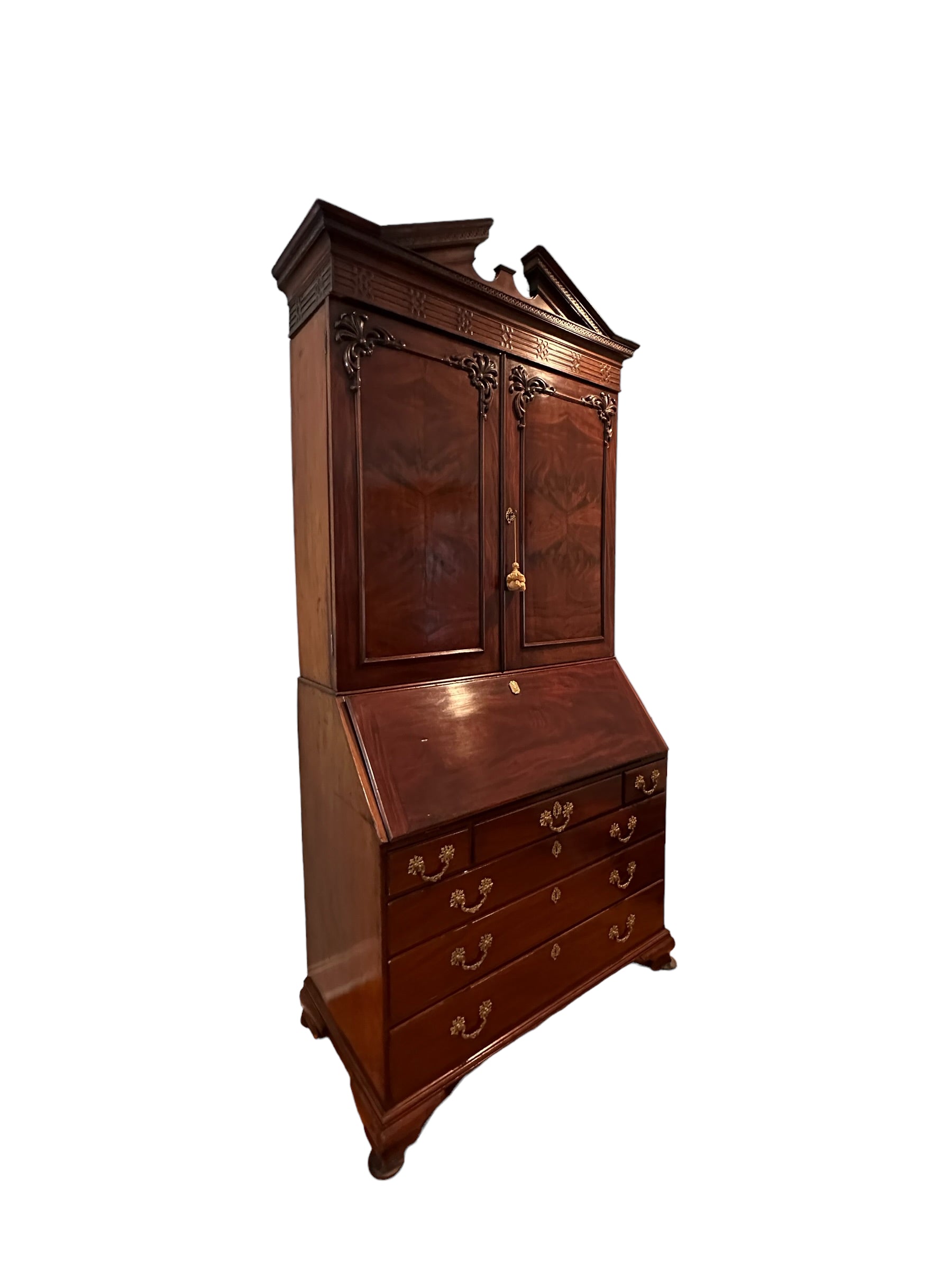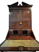 The top portion of this piece features an arched pediment and adjustable bookshelves enclosed by a pair of carved and paneled doors. The secretary opens to expose a magnificent interior with a green leather top. Beautiful fitted drawers and a removable center door reveal secret drawers on the reverse. This feature is perfect for keeping valuables.