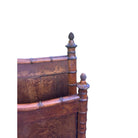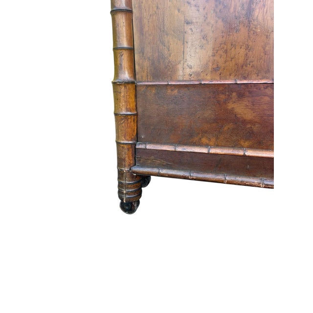 Panels of rich birds eye maple provide a beautiful contrast, lending a depth and shimmer that complements the warm patina of the fruitwood frame. French faux bamboo emerged as a fresh alternative to the opulence of Victorian furnishings, celebrating the lightness and exotic influence of Far Eastern design while retaining timeless appeal.
