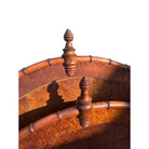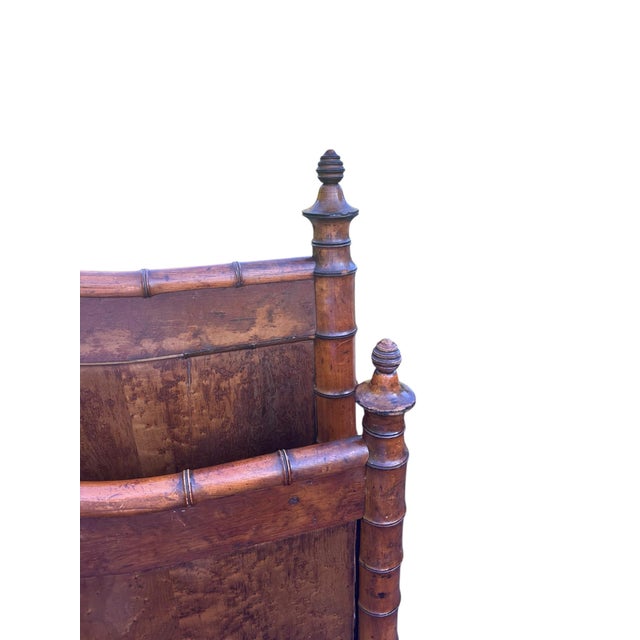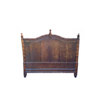A striking example of late 19th to early 20th century French design, this bed is a true antique. It blends the natural charm of fruitwood with the refined craftsmanship of faux bamboo. The gently arched headboard and footboard are framed with turned faux bamboo uprights and capped with delicately carved finials—each bedpost topped with a smaller finial, and a grander finial crowning the center crest. The wood has a beautiful patina.