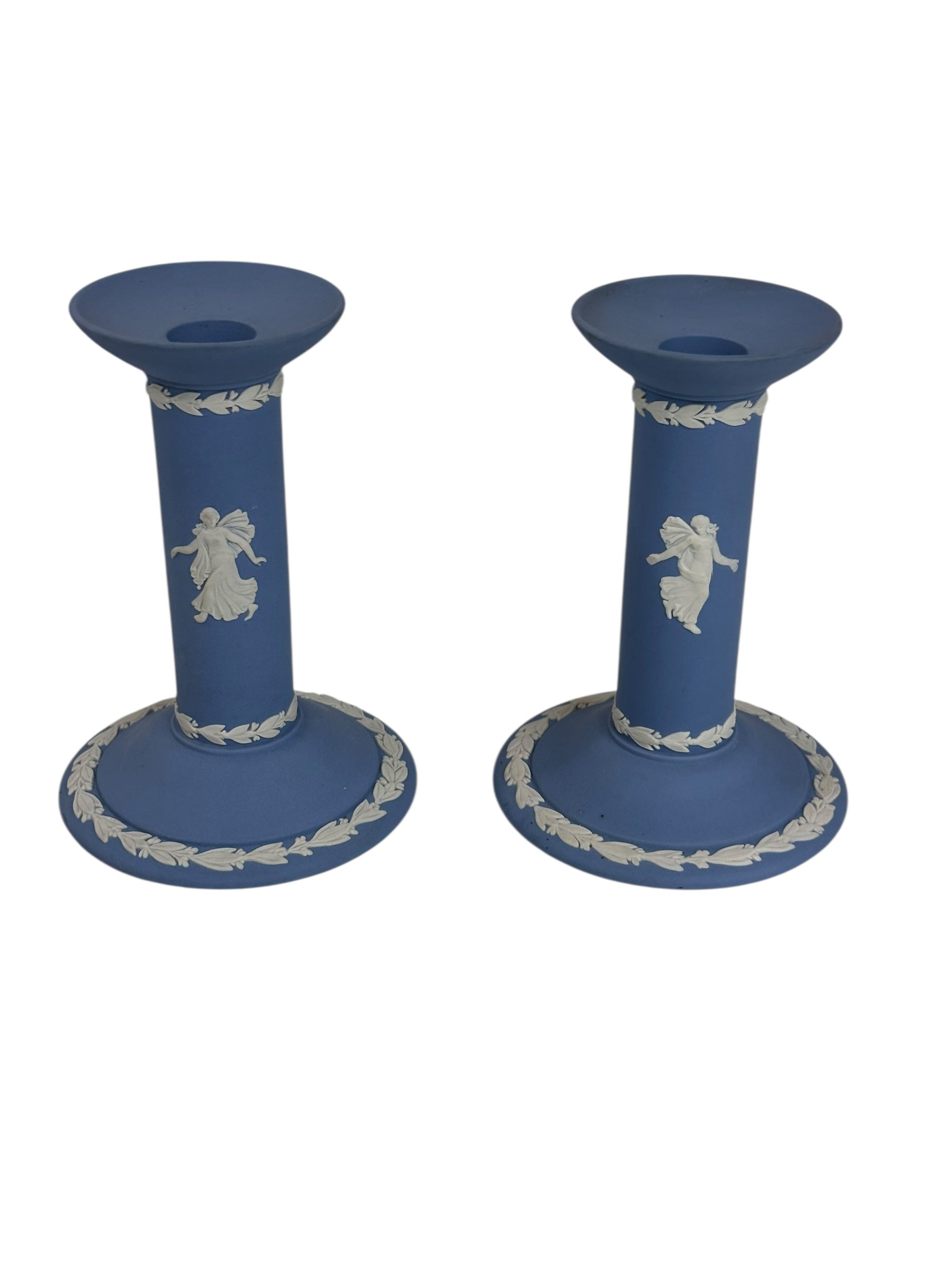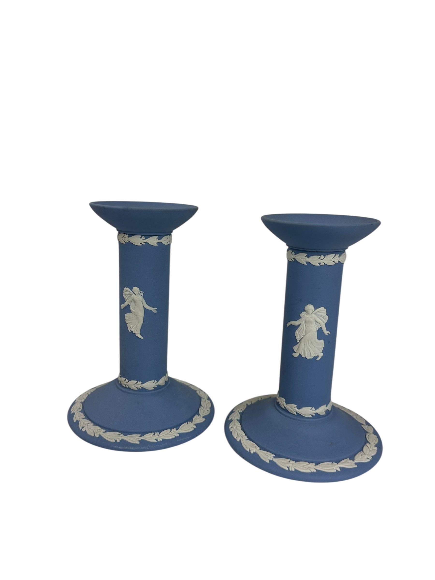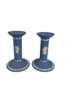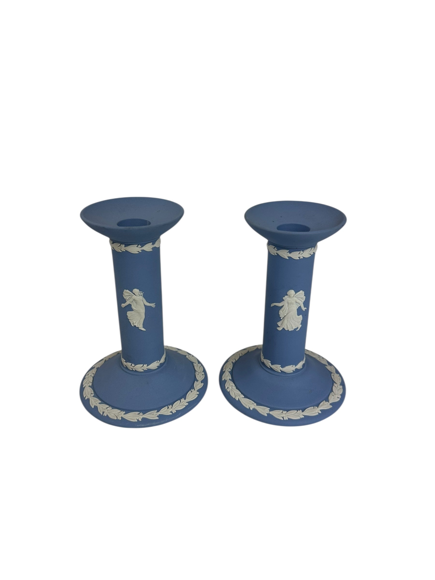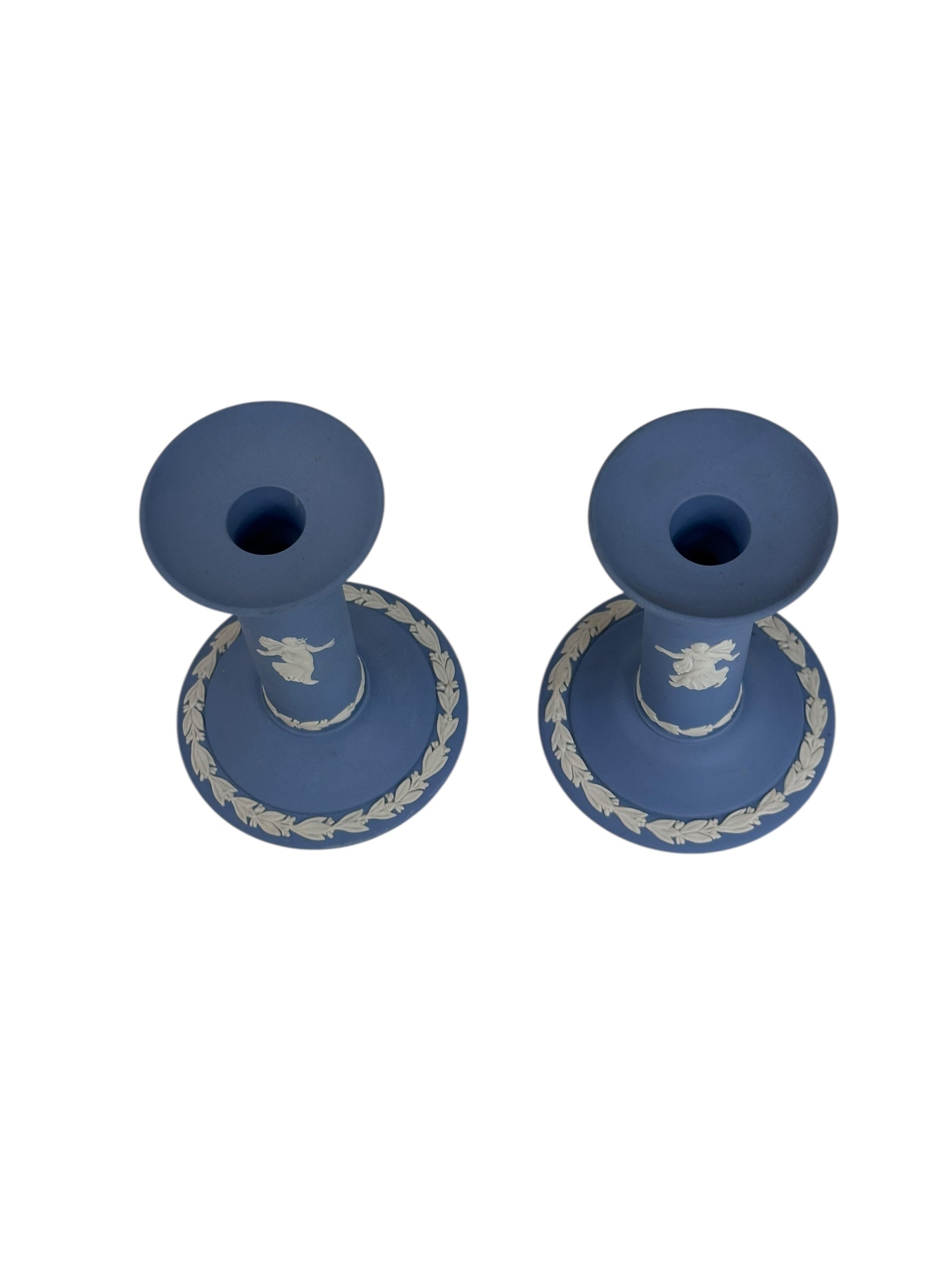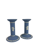 A classic pair of Wedgwood blue Jasperware candlesticks featuring the iconic white relief neoclassical motifs of dancing muses, framed by laurel leaf borders. Crafted in England in the late 20th century, these candlesticks reflect the timeless beauty of Josiah Wedgwood’s signature design — elegant, restrained, and distinctly English.