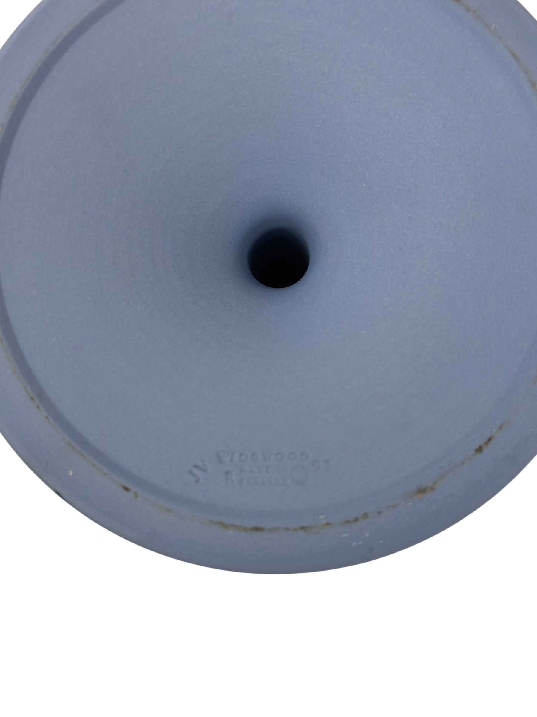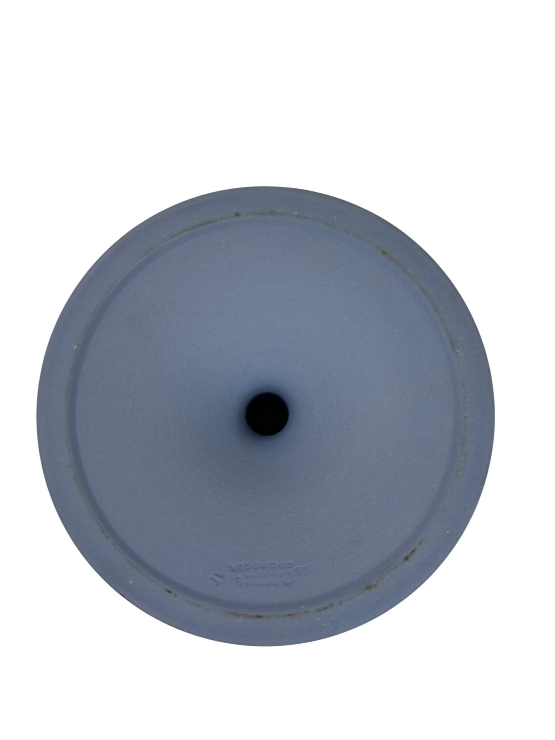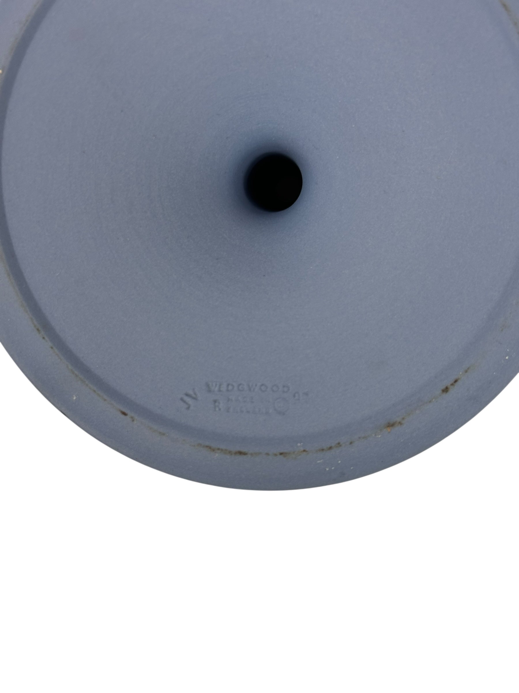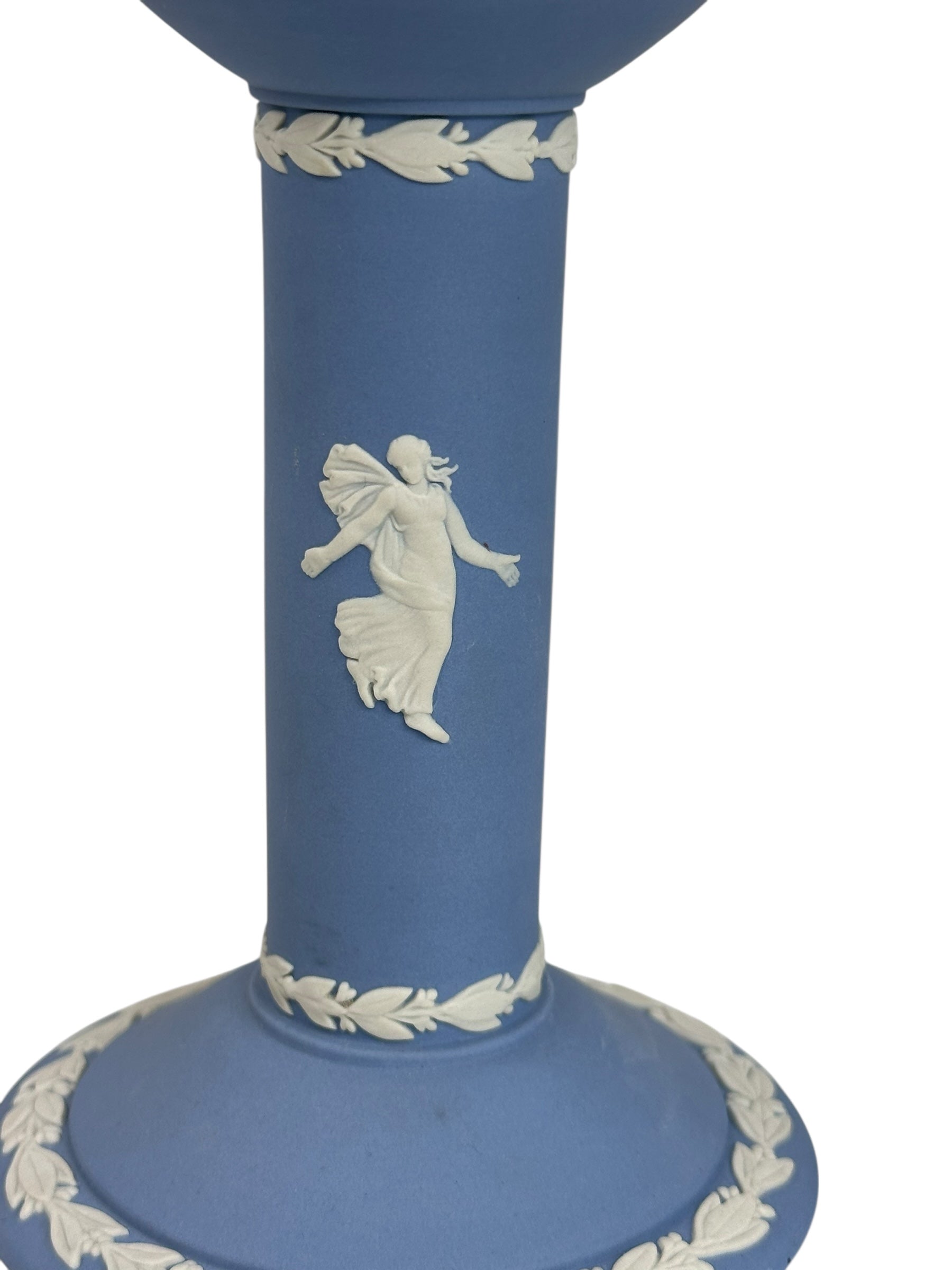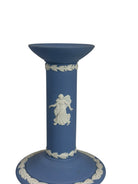 A classic pair of Wedgwood blue Jasperware candlesticks featuring the iconic white relief neoclassical motifs of dancing muses, framed by laurel leaf borders. Crafted in England in the late 20th century, these candlesticks reflect the timeless beauty of Josiah Wedgwood’s signature design — elegant, restrained, and distinctly English.